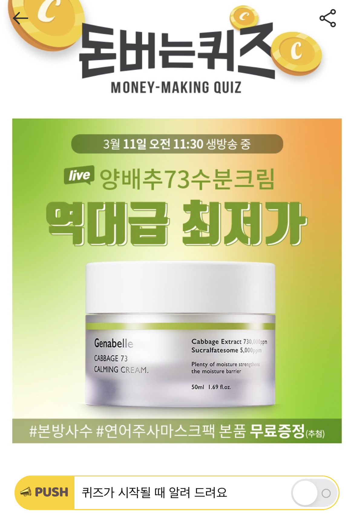 캐시워크 돈버는 퀴즈 정답 쿠팡 라이브 양배추73수분크림 브랜드명