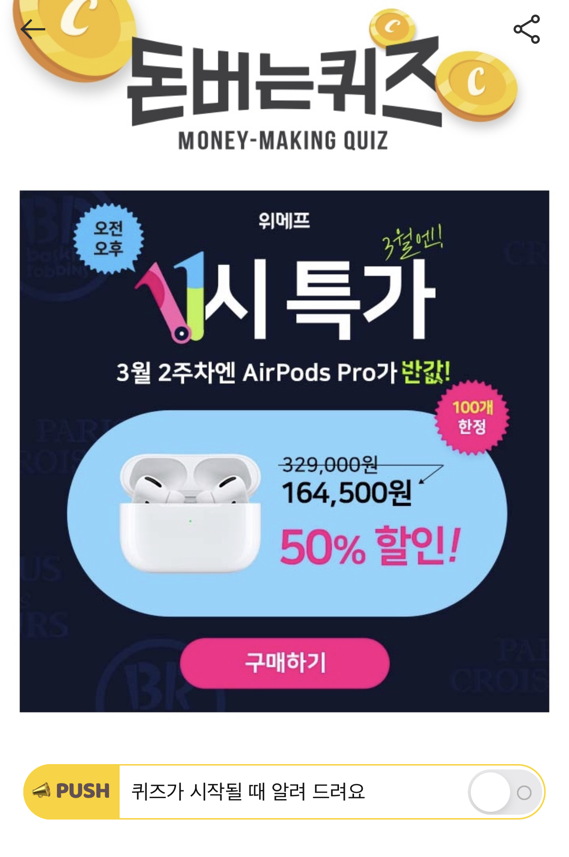캐시워크 돈버는 퀴즈 정답 위메프 11시특가 ㅁㅋㄹ
