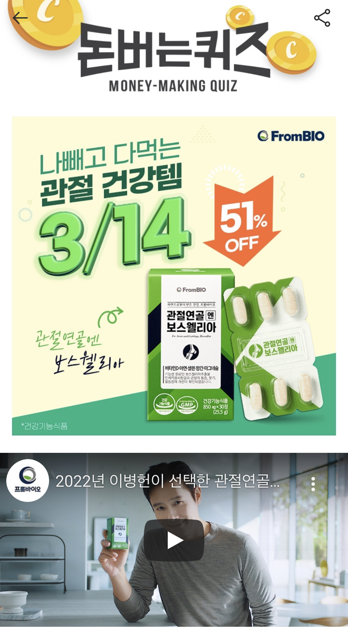 캐시워크 돈버는 퀴즈 정답 프롬바이오 관절연골엔 보스웰리아