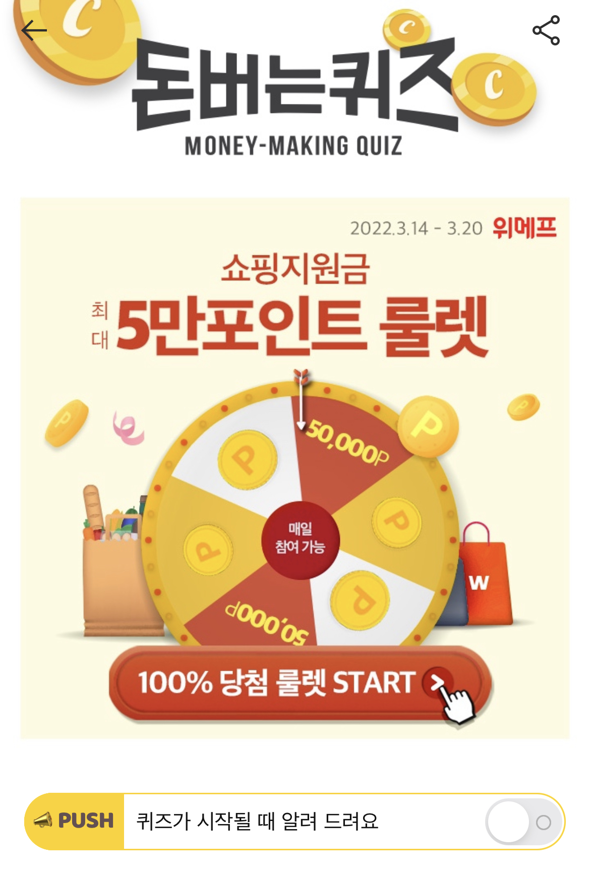 캐시워크 돈버는 퀴즈 정답 위메프 최대 5만포인트 룰렛 이벤트 숫자