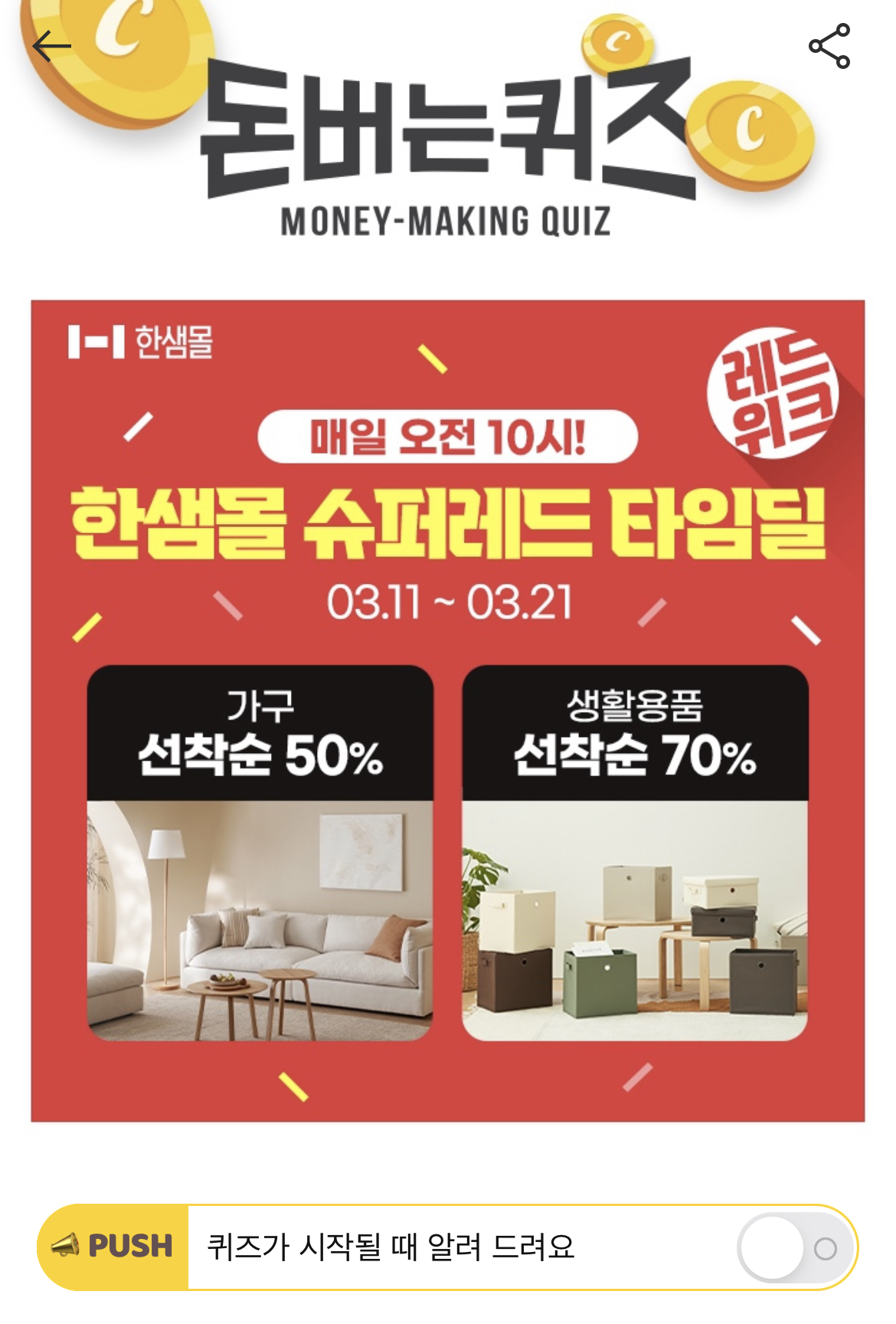 캐시워크 돈버는 퀴즈 정답 한샘몰 베스트 소파 ㅂㄴㄹ