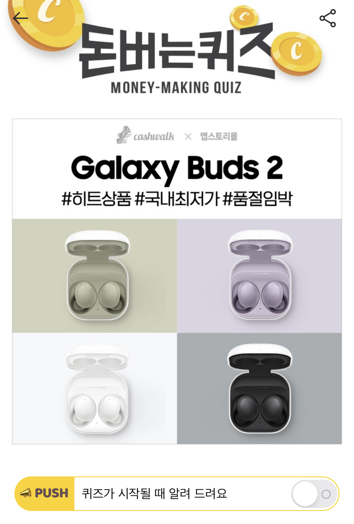 캐시워크 돈버는 퀴즈 정답 삼성 갤럭시 버즈2 블루투스 이어폰 ㅅㅇㅈㄱ