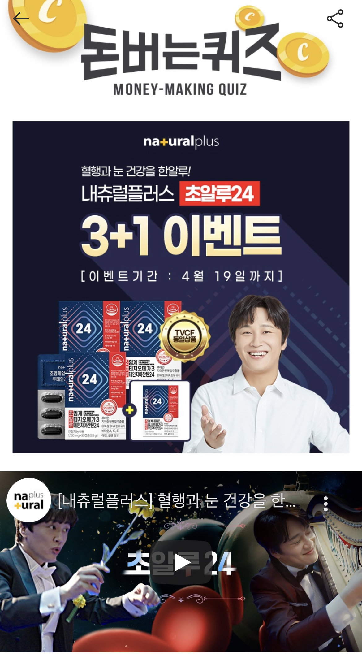 캐시워크 돈버는 퀴즈 정답 내츄럴플러스 신제품 초알루24 ㄹㅌㅇㅈㅇㅈㅌ 차태현의 내츄럴플러스에서 신제품 '초알루24' 대 출시! 혈행건강을 도움을 주는 초임계 알티지 오메가3와 눈건강을 도움을 주는 OOOOOOO원료가 만났다. 이 원료는 무엇일까? (힌트: ㄹㅌㅇㅈㅇㅈㅌ)