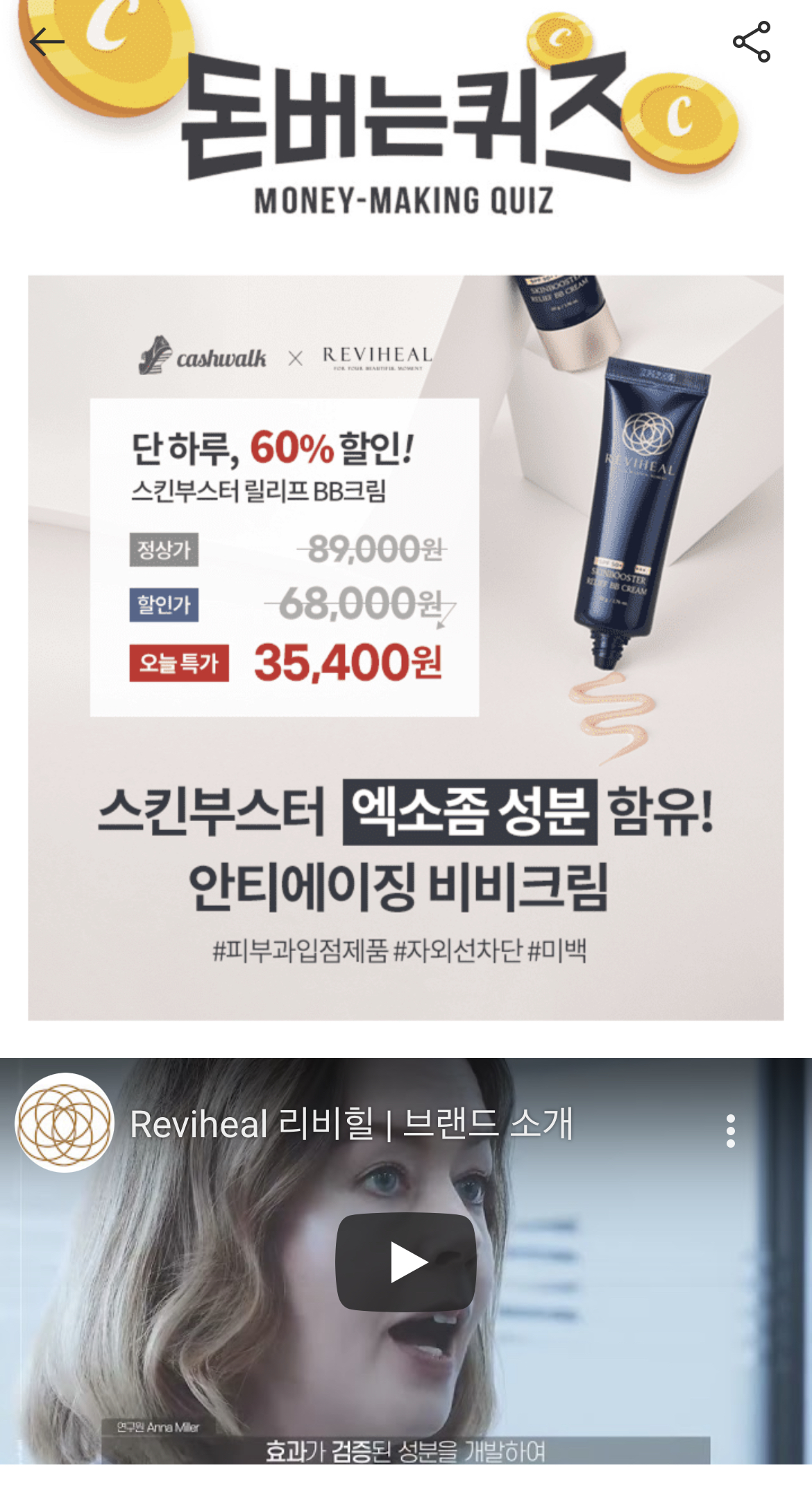캐시워크 돈버는 퀴즈 정답 리비힐 스킨부스터 릴리프 비비크림 ㅈㄱㅅㅍ