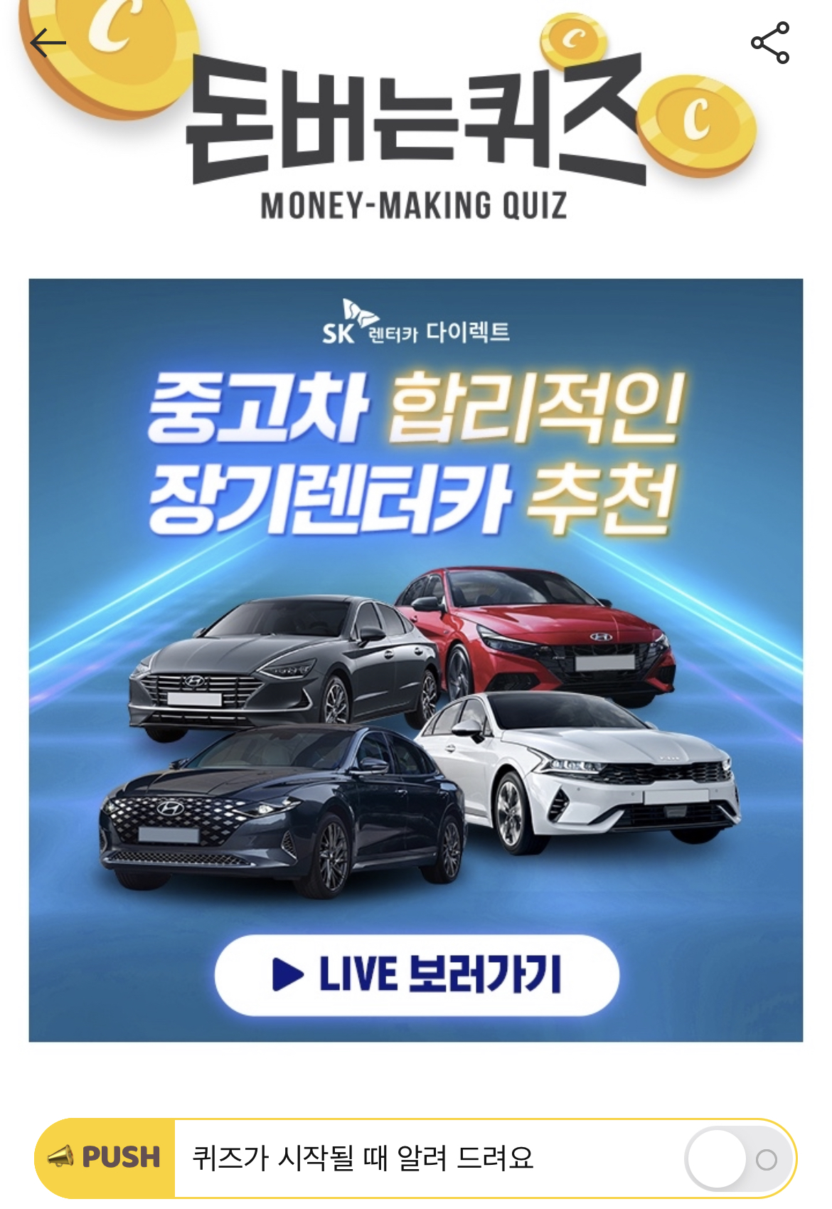 캐시워크 돈버는 퀴즈 정답 SK렌터카 다이렉트 라이브방송 ㅎㅈㅅㄹ
