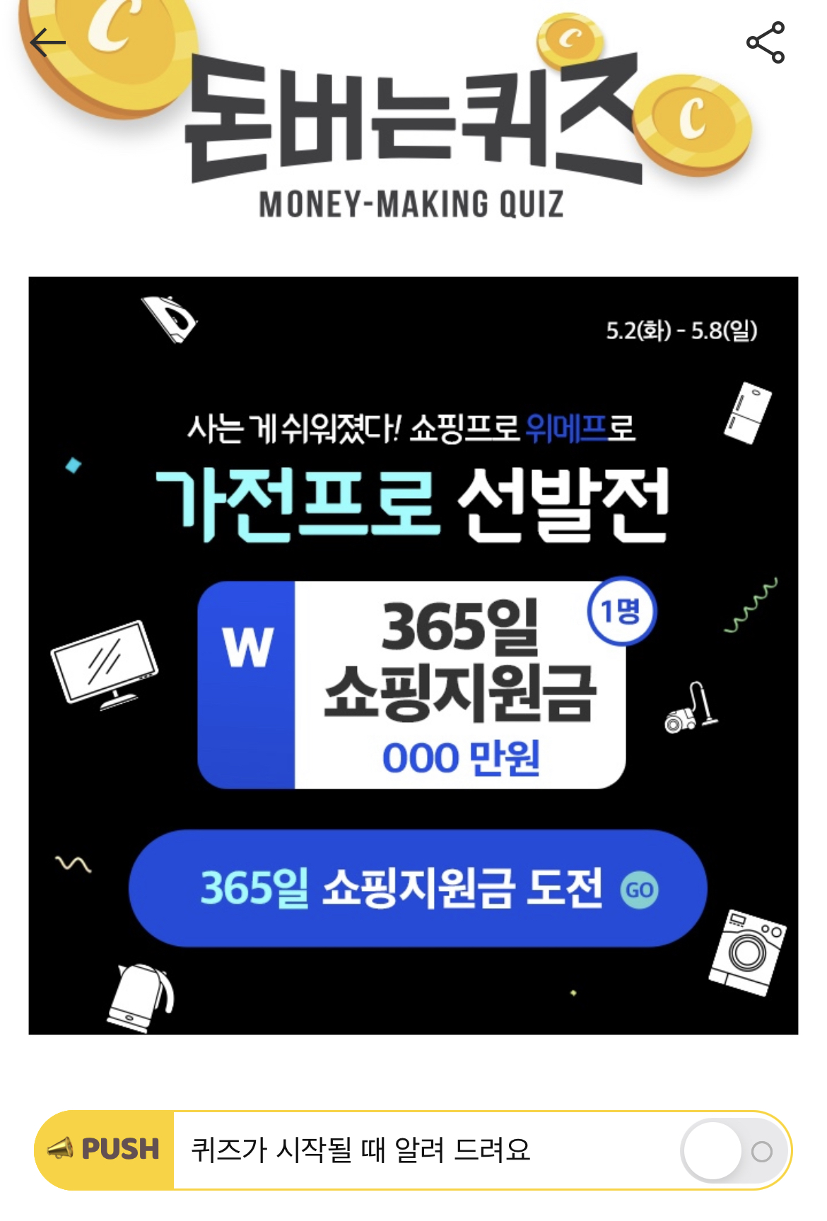 캐시워크 돈버는 퀴즈 정답 위메프 가전프로 선발전 숫자+한글 5월2일~5월8일 진행되는 가전프로 선발전! 가전은 어려워도 쇼핑은 쉬워야지~!! 나만 알고 있는 가전제품 사용 꿀팁만 남기고 가전프로가 되면 OOOOO 365일 쇼핑지원금을 드립니다! 과연 빈칸에 들어갈 단어는 무엇일까요? (힌트 : 숫자+한글) 정답:365만원