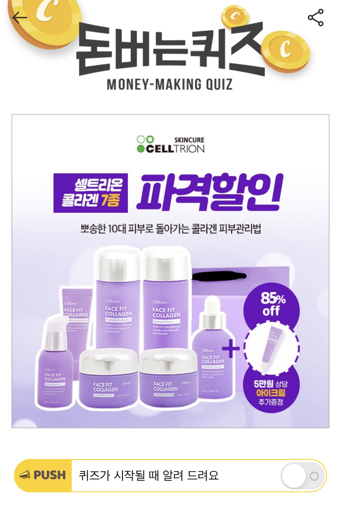 캐시워크 돈버는 퀴즈 정답 셀트리온 셀린온 페이스핏 OOO스킨 케어 7 ㅋㄹㄱ