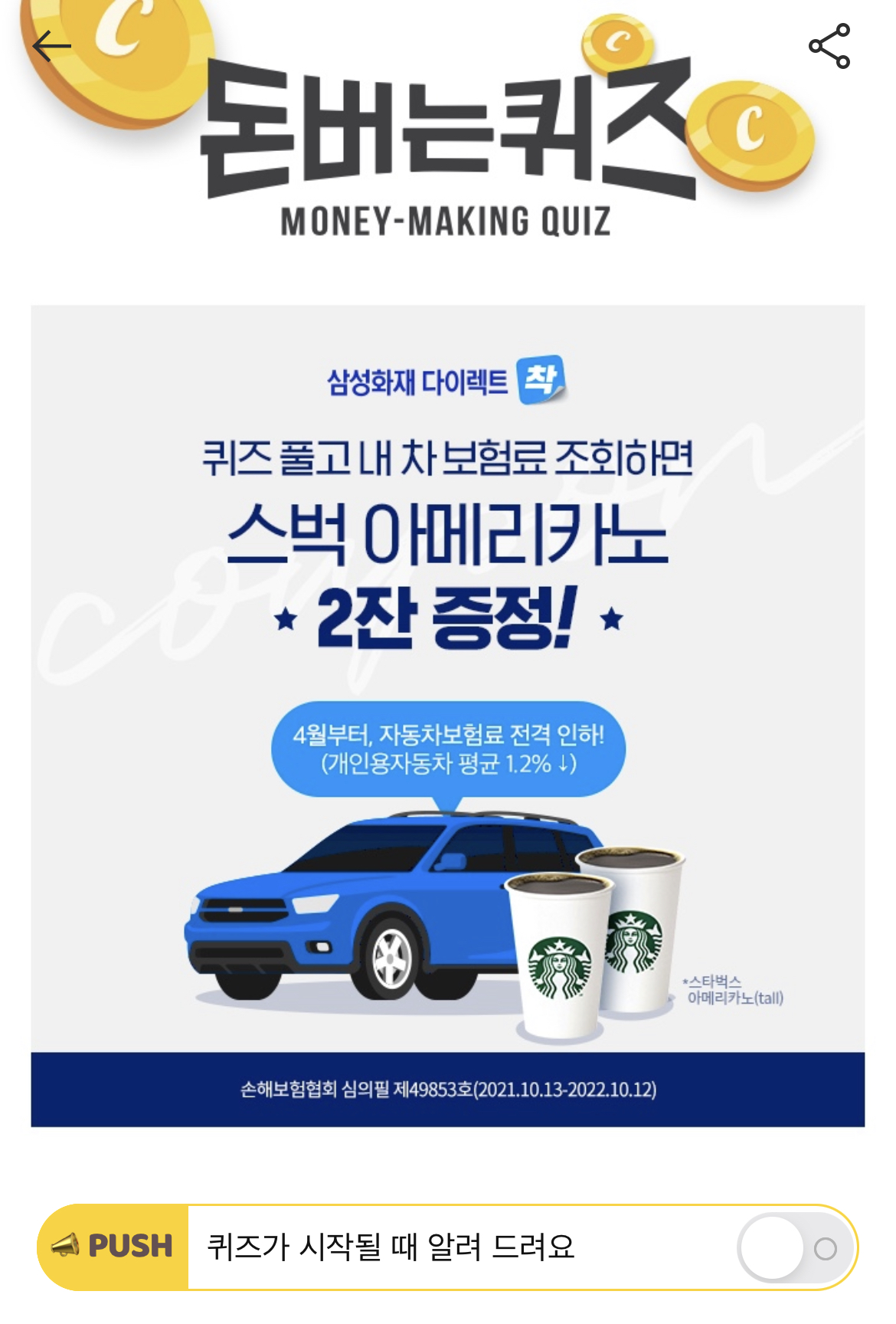 캐시워크 돈버는 퀴즈 정답 삼성화재 다이렉트 착 자동차보험료