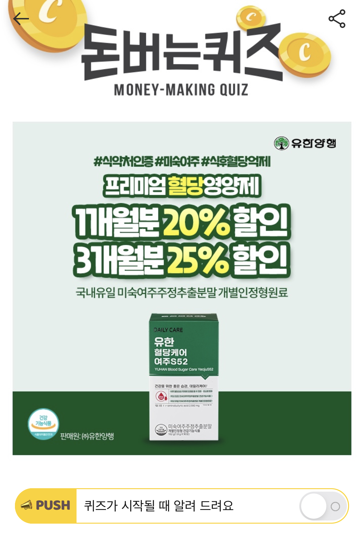캐시워크 돈버는퀴즈 정답 유한양행 혈당영양제 여주s52 숫자