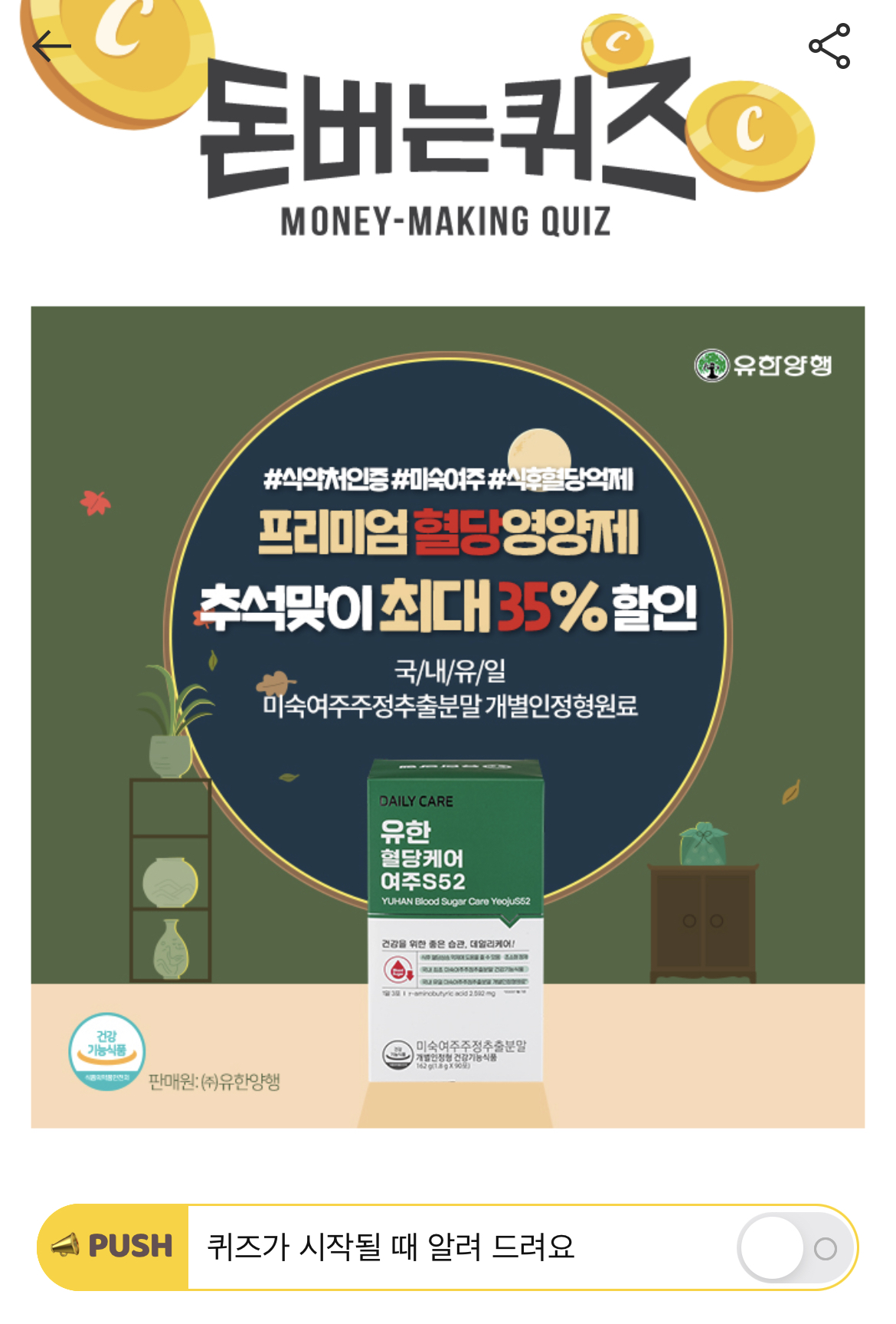 캐시워크 돈버는 퀴즈 정답 유한양행 미숙여주 유한 혈당케어 여주S52 당뇨위험 요인