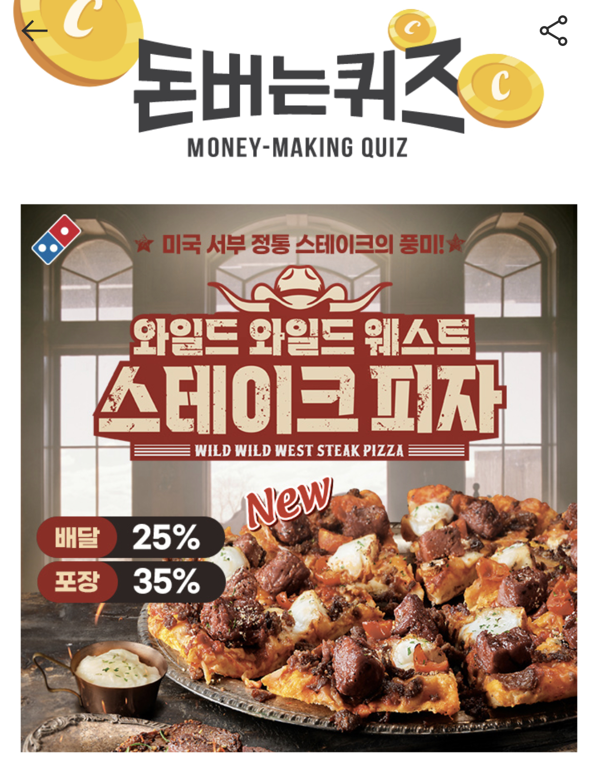 캐시워크 돈버는 퀴즈 정답 도미노피자 와일드 와일드 웨스트 스테이크 피자 ㅁㅂㄹ