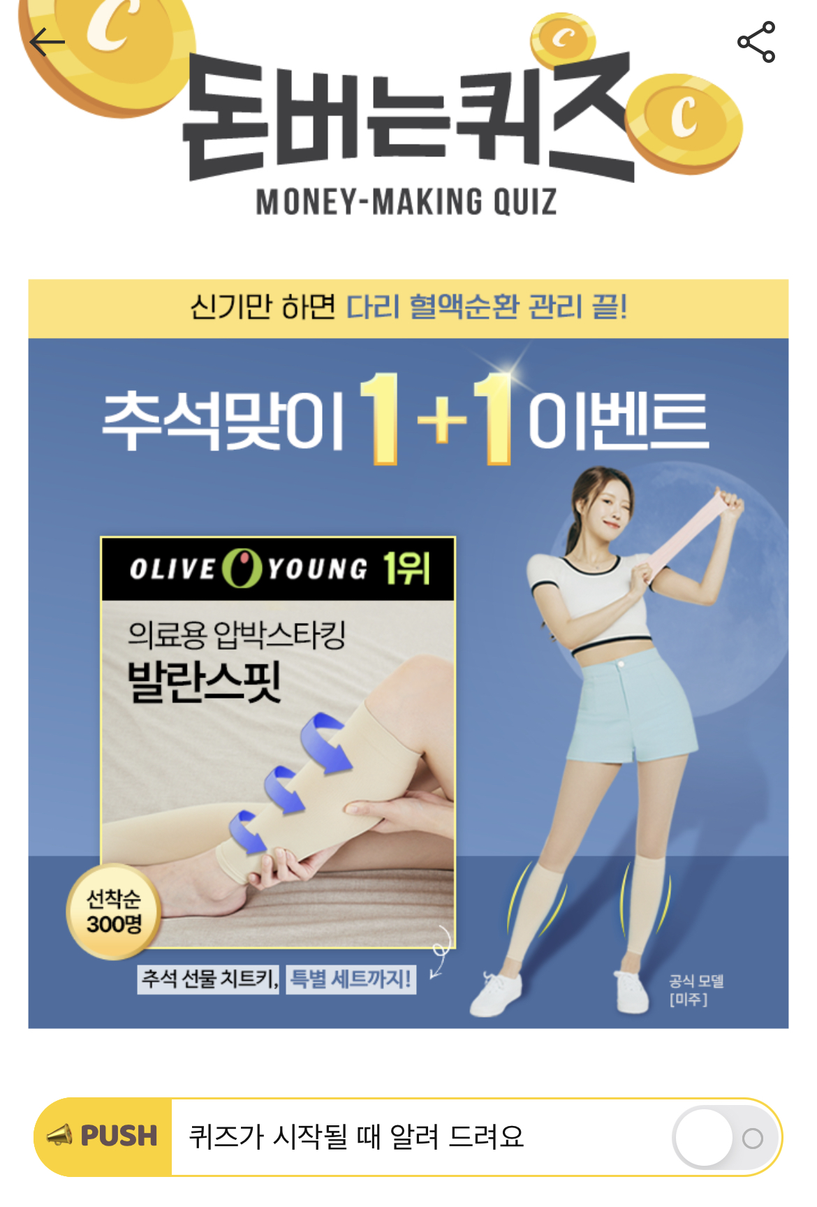 캐시워크 돈버는퀴즈 정답 올리브영 압박스타킹 중 압도적 매출 1위 발란스핏 압박스타킹