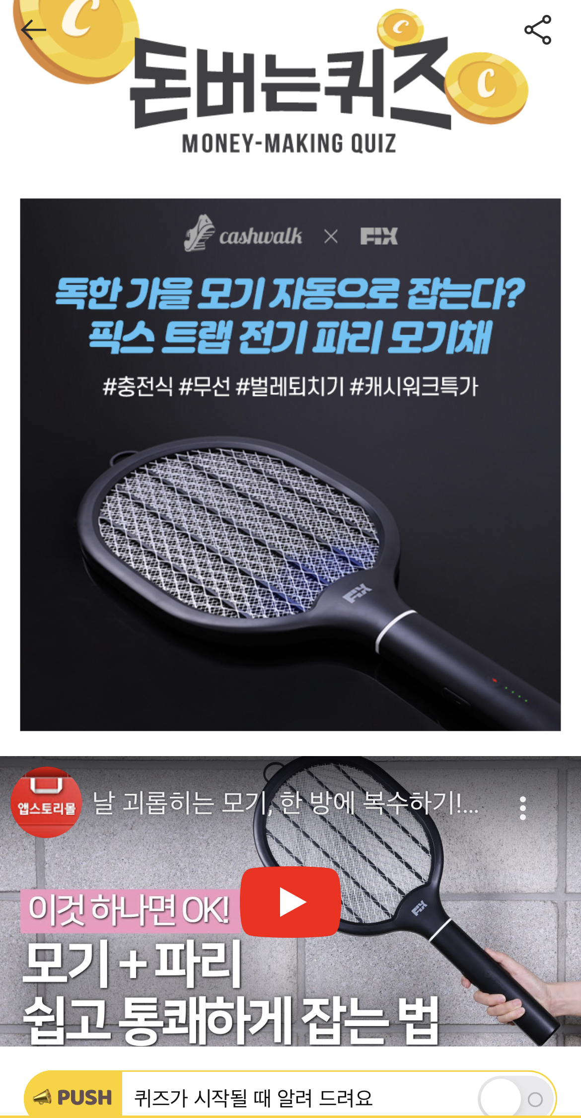 캐시워크 돈버는 퀴즈 정답 픽스 트랩 전기 파리 모기채 ㅈㅈㄱ