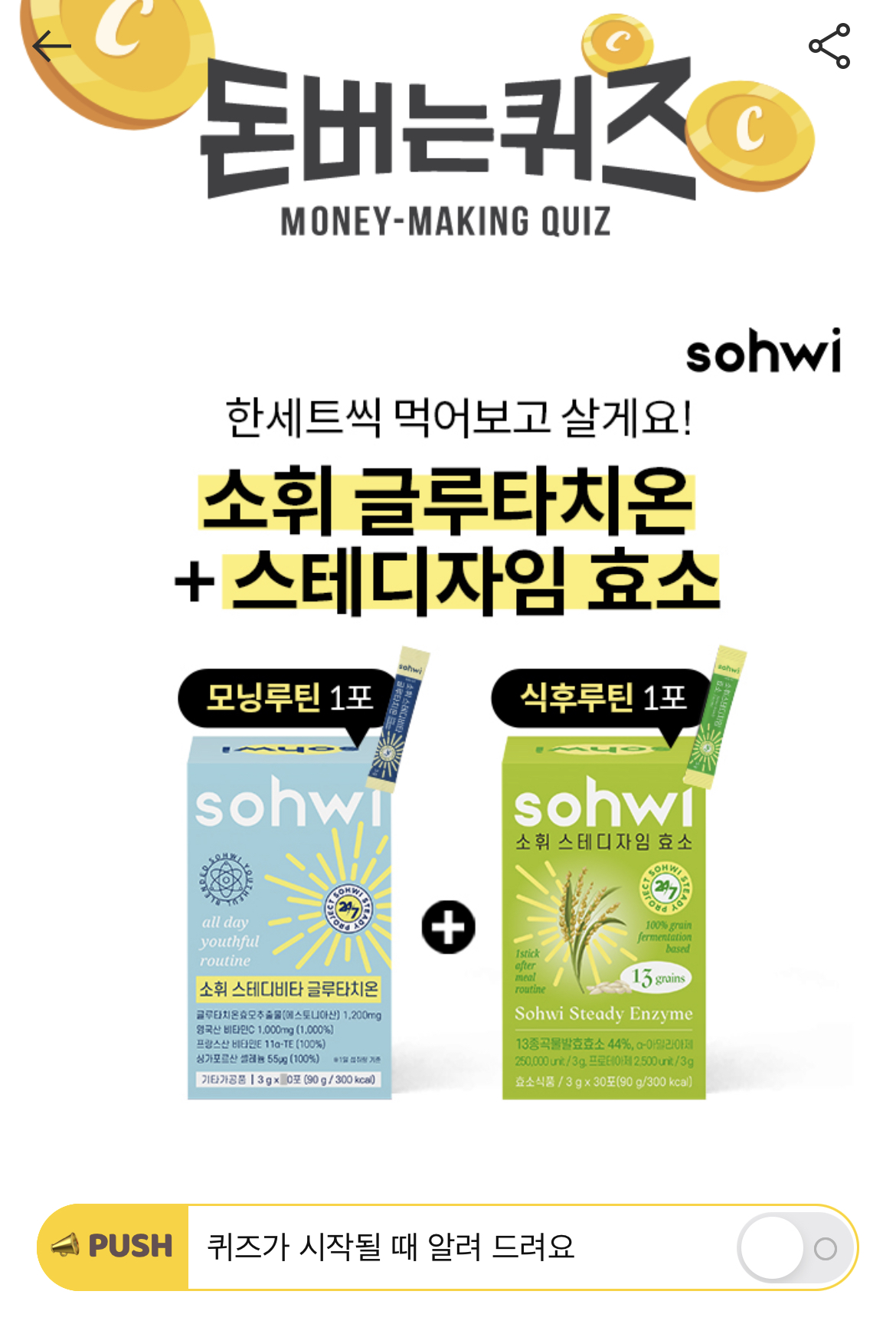 평생 먹을 수 있는 소휘 스테디 식후 루틴 패키지는 공식 스토어에서 소식알림을 하면 즉시 O% 할인을 추가로 받으실 수 있습니다. O에 들어갈 숫자는 무엇일까요?