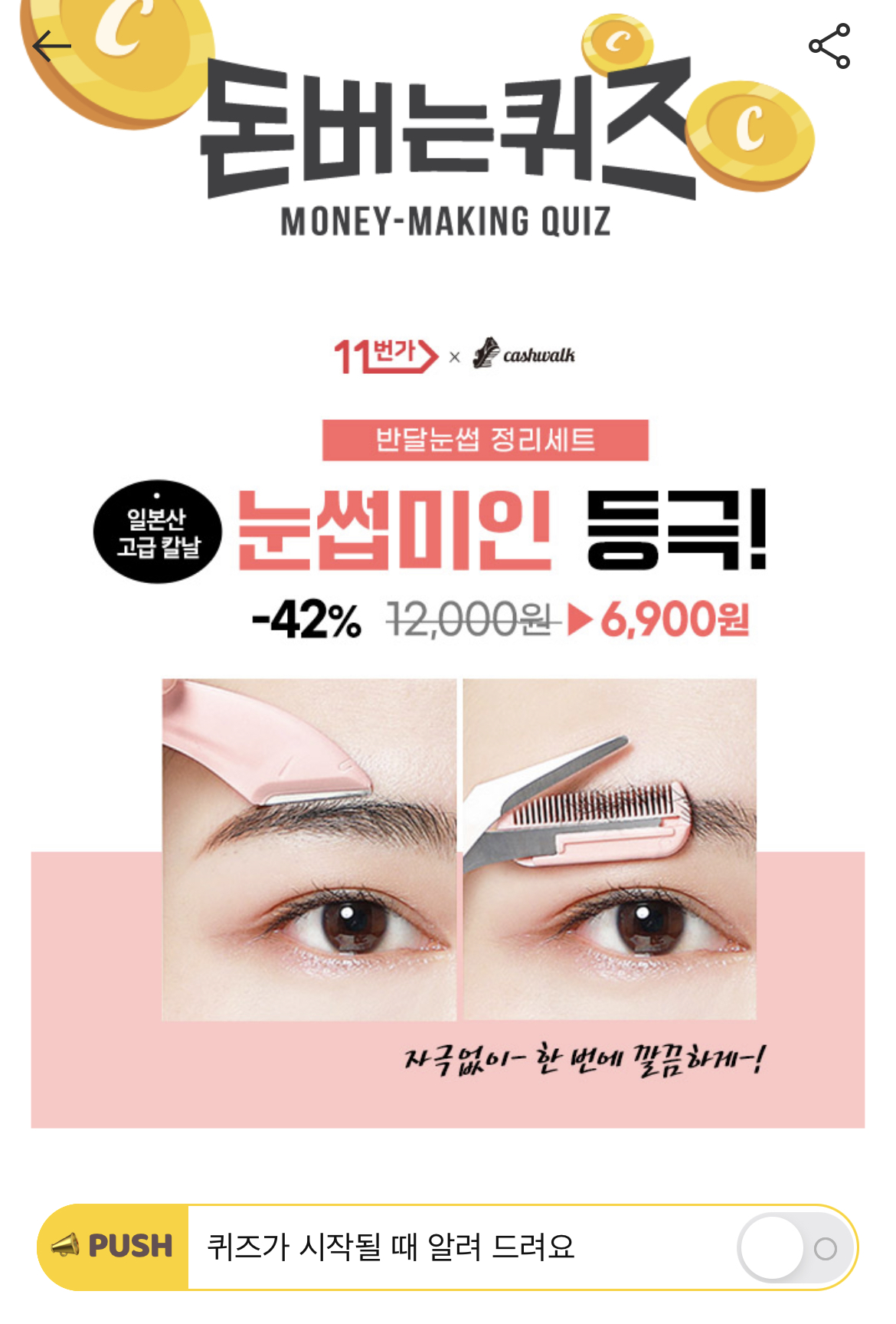캐시워크 돈버는 퀴즈 정답 11번가 반달 눈썹 정리세트 ㄱㄱㅋㄴ