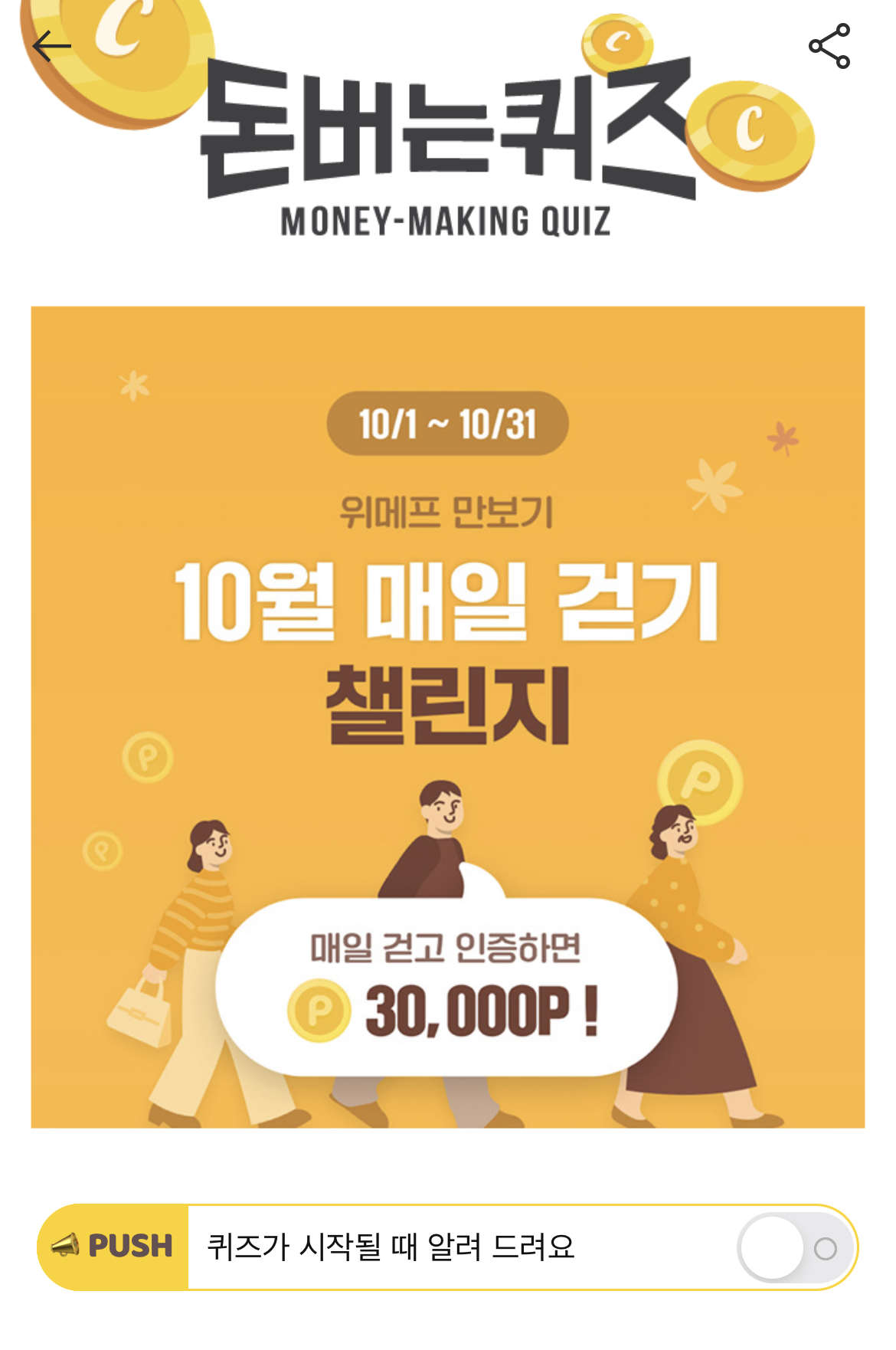 위메프 걸으면 얻을 수 있는 소확행! 만보기 인증하면 최대 30,000P를 얻을 수 있는 OO OO OOO 지금 바로 참여하세요~! 과연 OO OO OOO에 들어갈 말은 무엇일까요? (힌트 : ㅁㅇ ㄱㄱ ㅊㄹㅈ)
