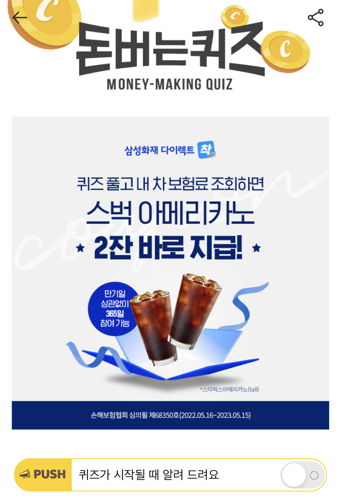 캐시워크 돈버는 퀴즈 정답 삼성화재 다이렉트 자동차보험 이벤트 보험료 OO 완료