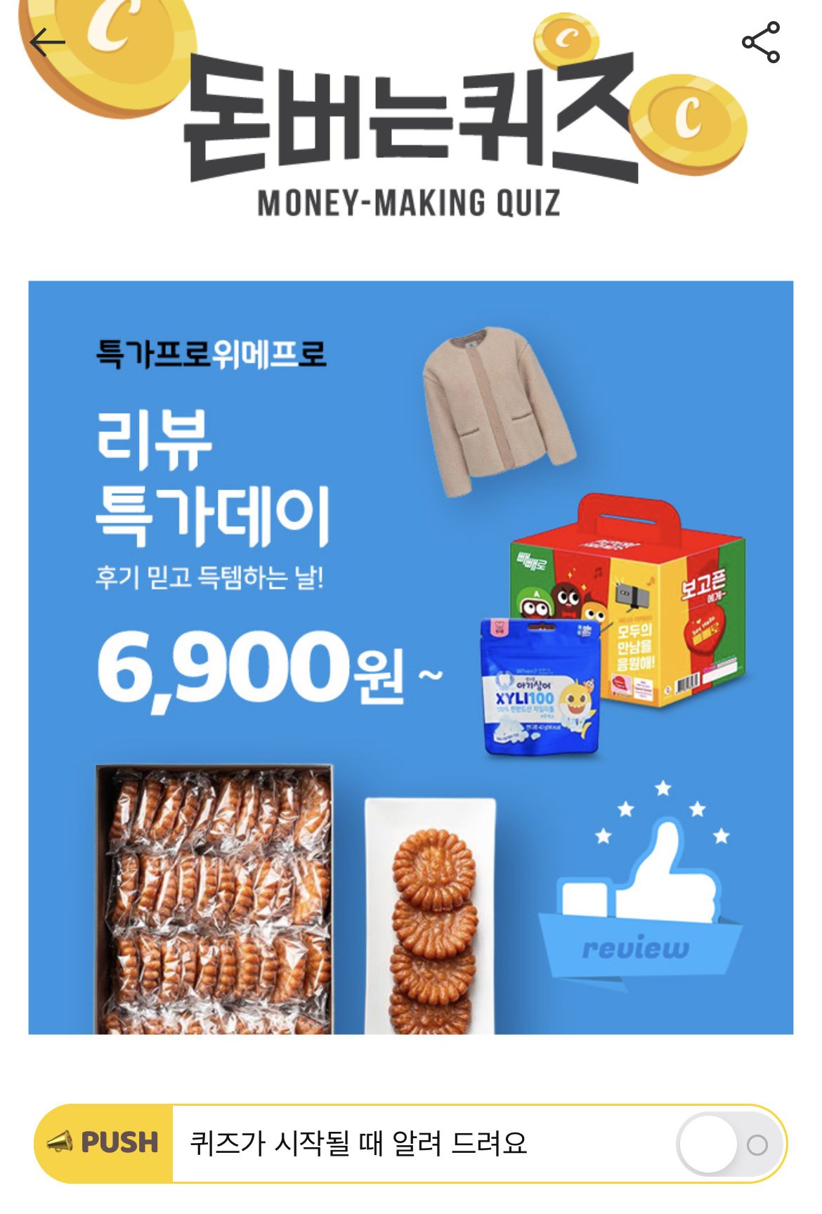 캐시워크 돈버는 퀴즈 정답 위메프 리뷰특가데이 위메프xOOO 라이브 방송