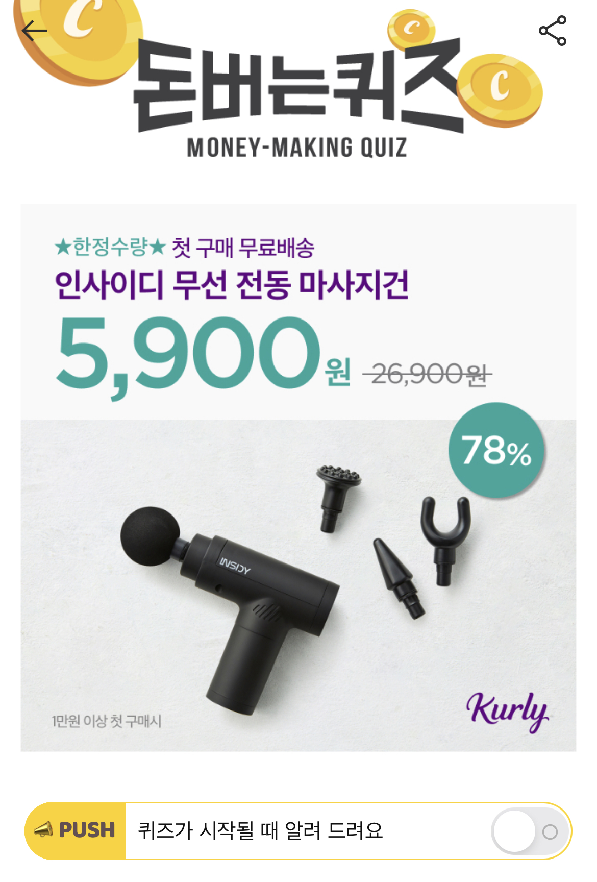 캐시워크 돈버는퀴즈 정답 마켓컬리 OOOO 무선 전동 마사지건 단어