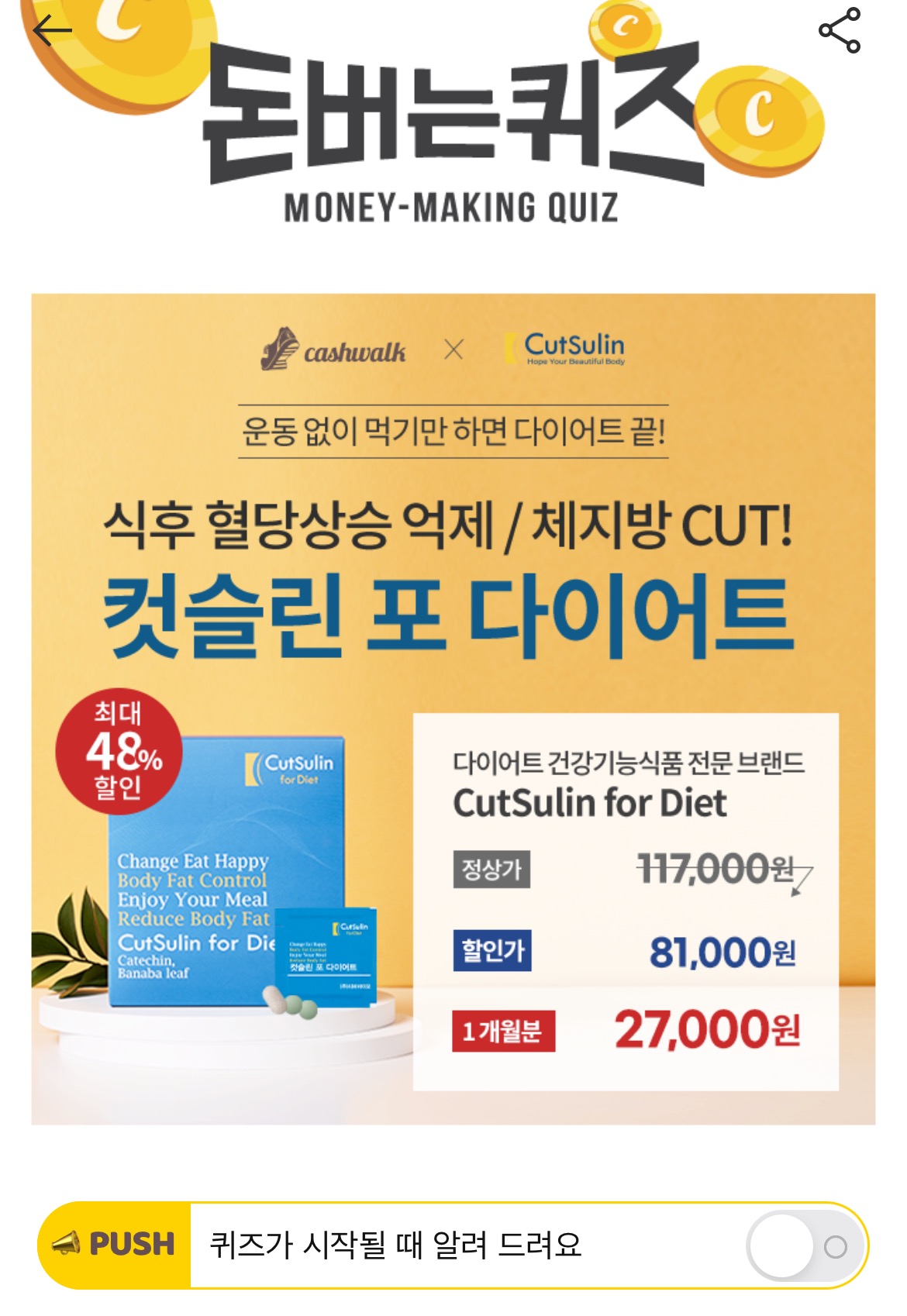 캐시워크 돈버는 퀴즈 정답 컷슬린 포 다이어트