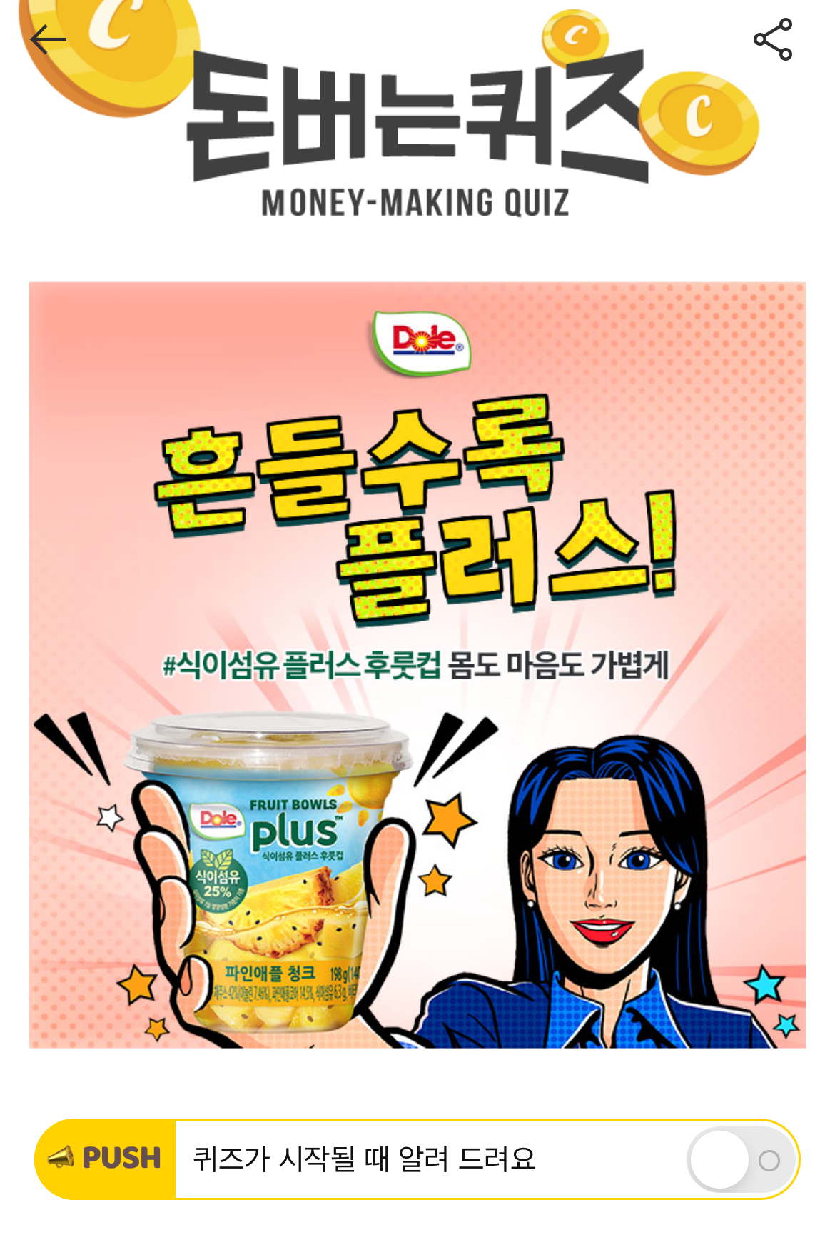 캐시워크 돈버는 퀴즈 정답 Dole 식이섬유 플러스 후룻컵