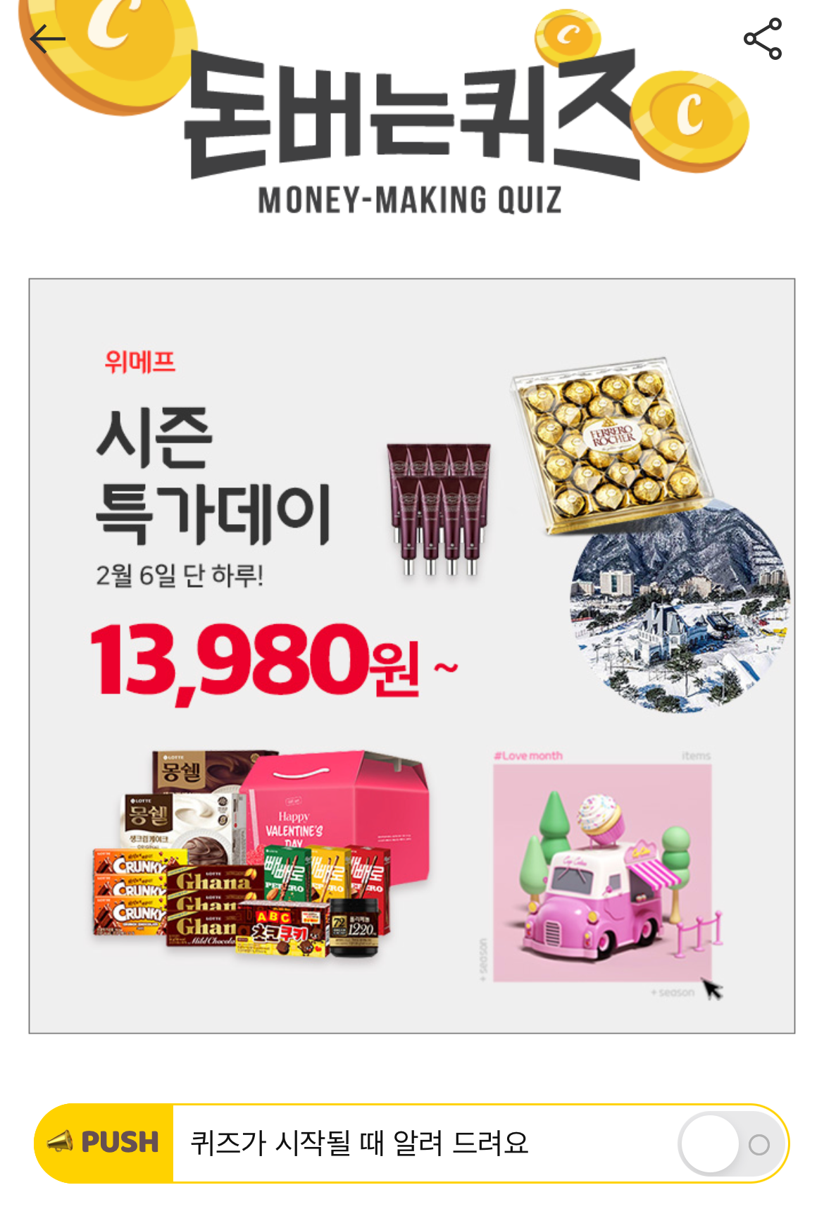 캐시워크 돈버는 퀴즈 정답 위메프 시즌특가데이