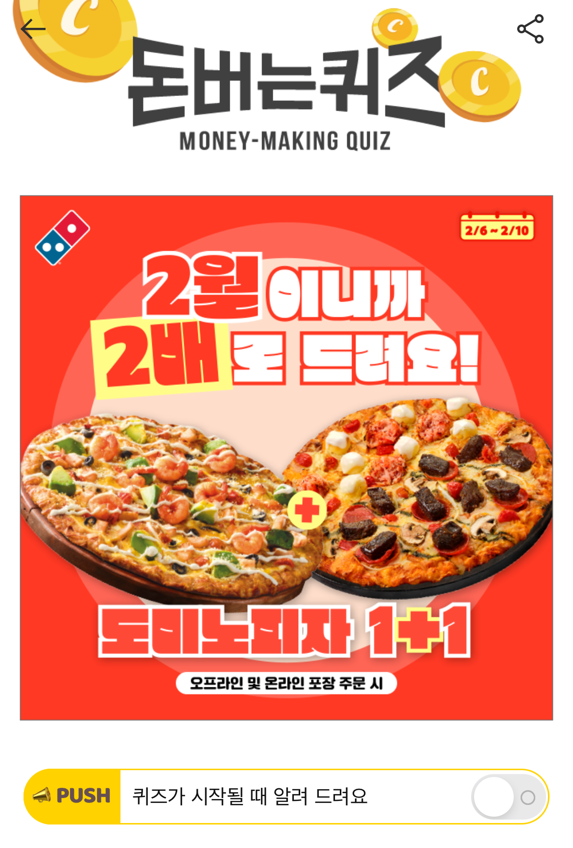 캐시워크 돈버는 퀴즈 정답 도미노피자 도미노가 2배 드림 ㅁㄷㅍㅈ