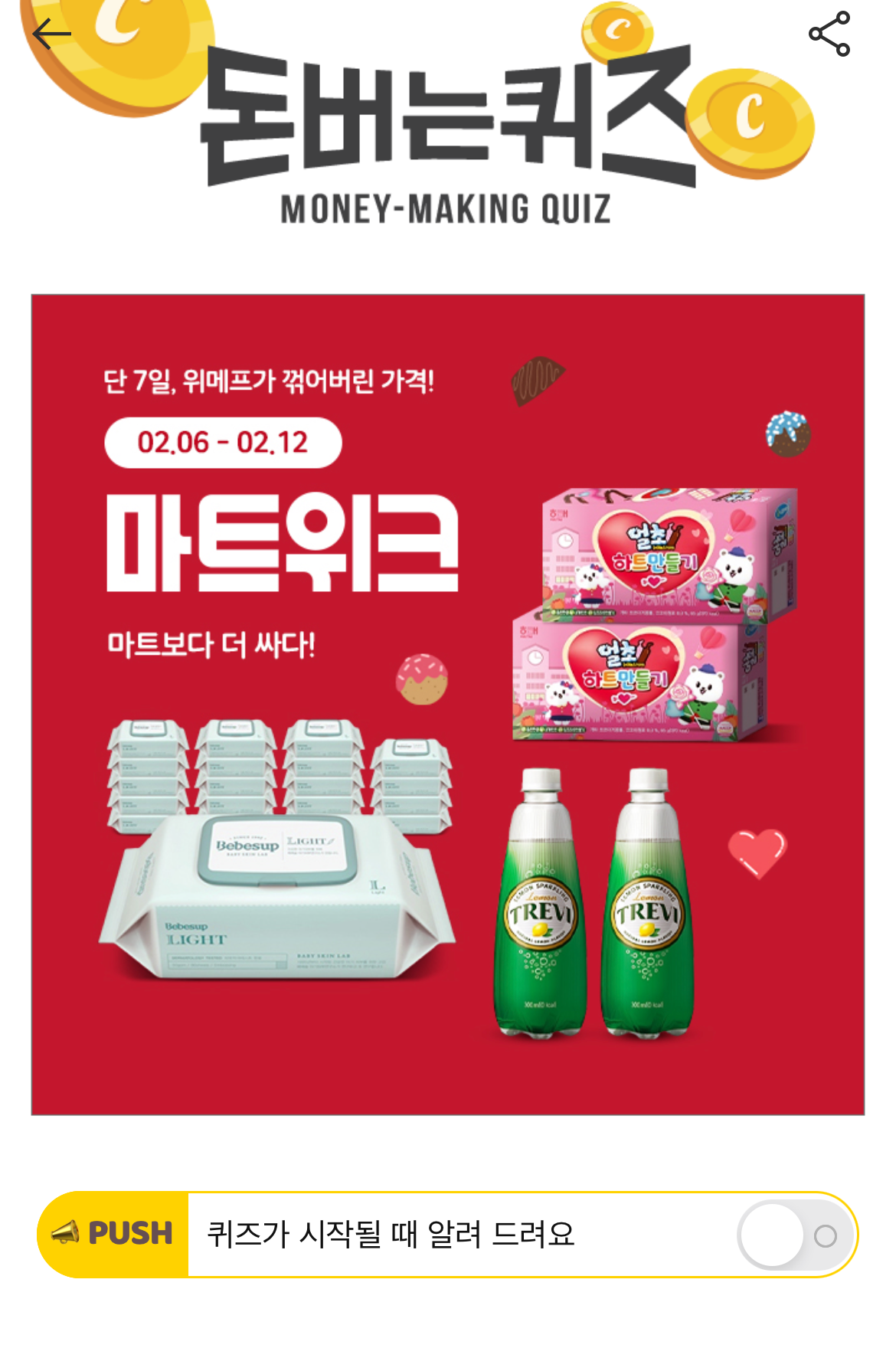 캐시워크 돈버는 퀴즈 정답 위메프 마트위크 O% 마트위크 장바구니 쿠폰 숫자