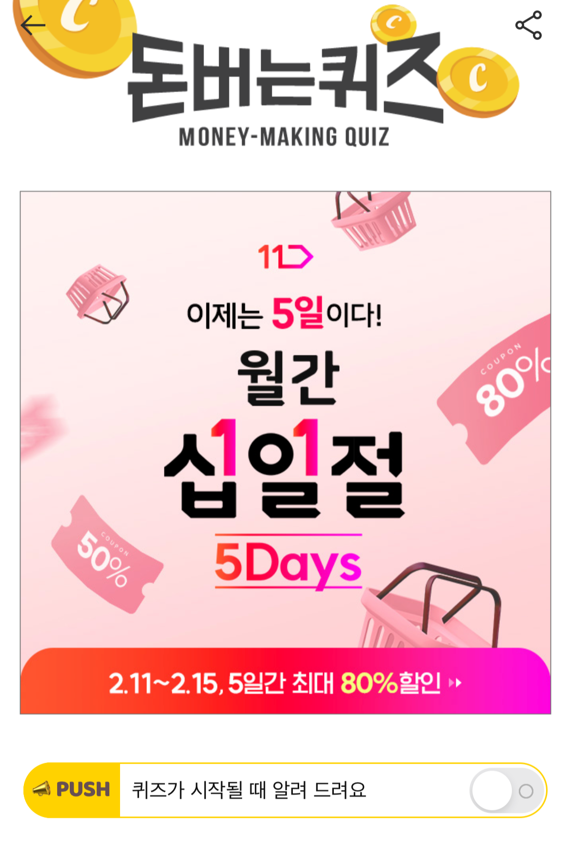 캐시워크 돈버는 퀴즈 정답 11번가 월간 십일절 날짜