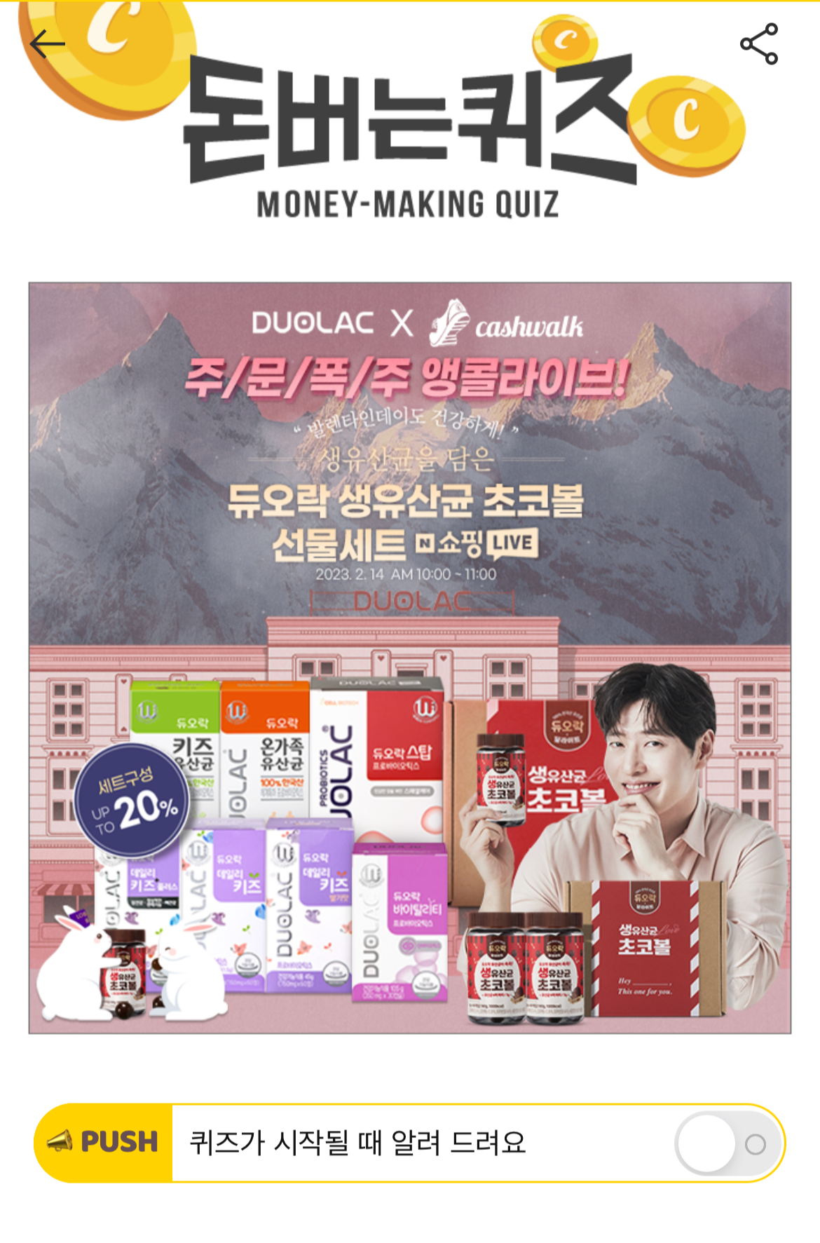 캐시워크 돈버는 퀴즈 정답 듀오락 발렌타인데이 기념 주문폭주 앵콜LIVE 영문 대문자