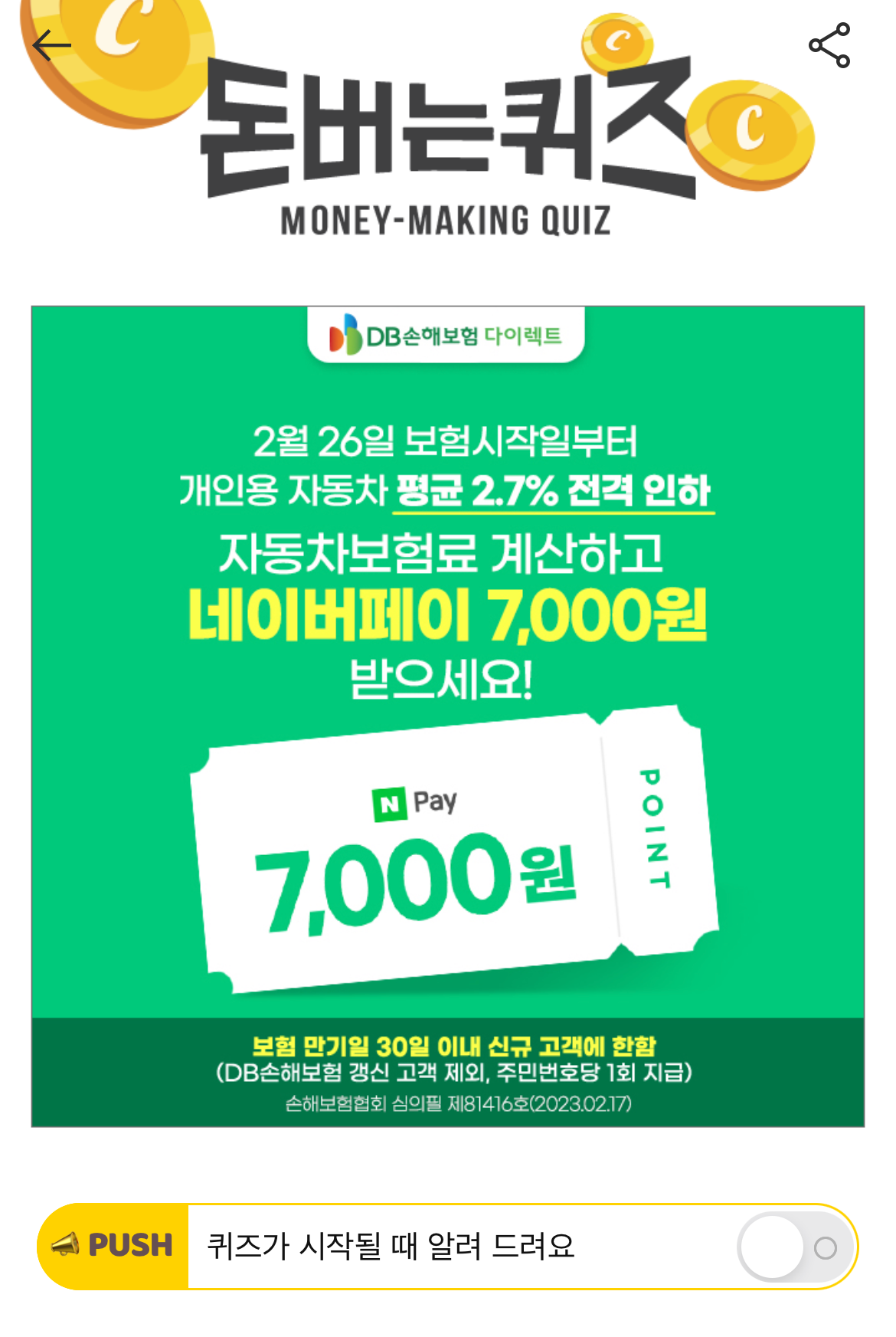 캐시워크 돈버는 퀴즈 정답 DB손해보험 다이렉트 개인용 OOO보험료