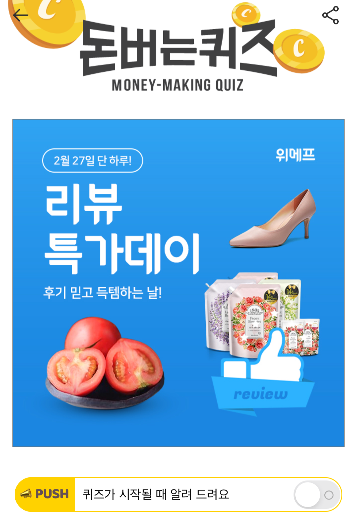 캐시워크 돈버는 퀴즈 정답 위메프 리뷰특가데이