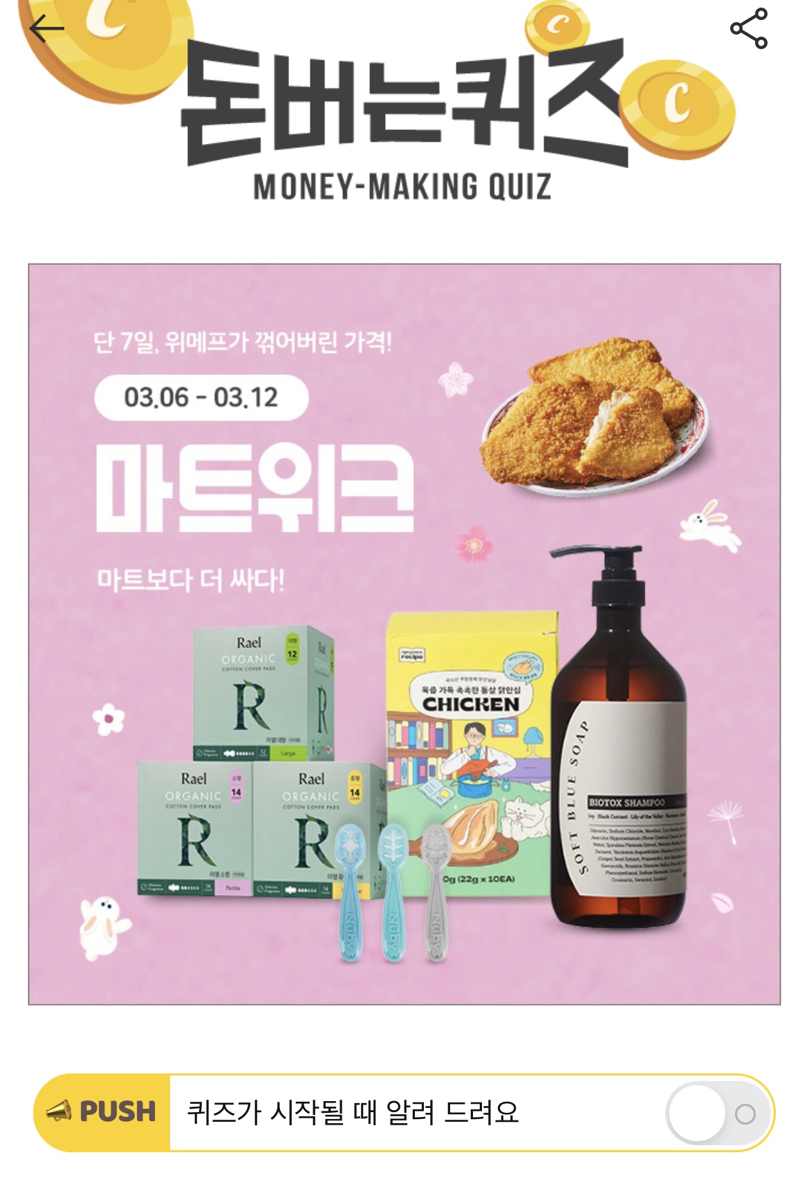 캐시워크 돈버는 퀴즈 정답 위메프 마트위크 OOOO 쿠폰
