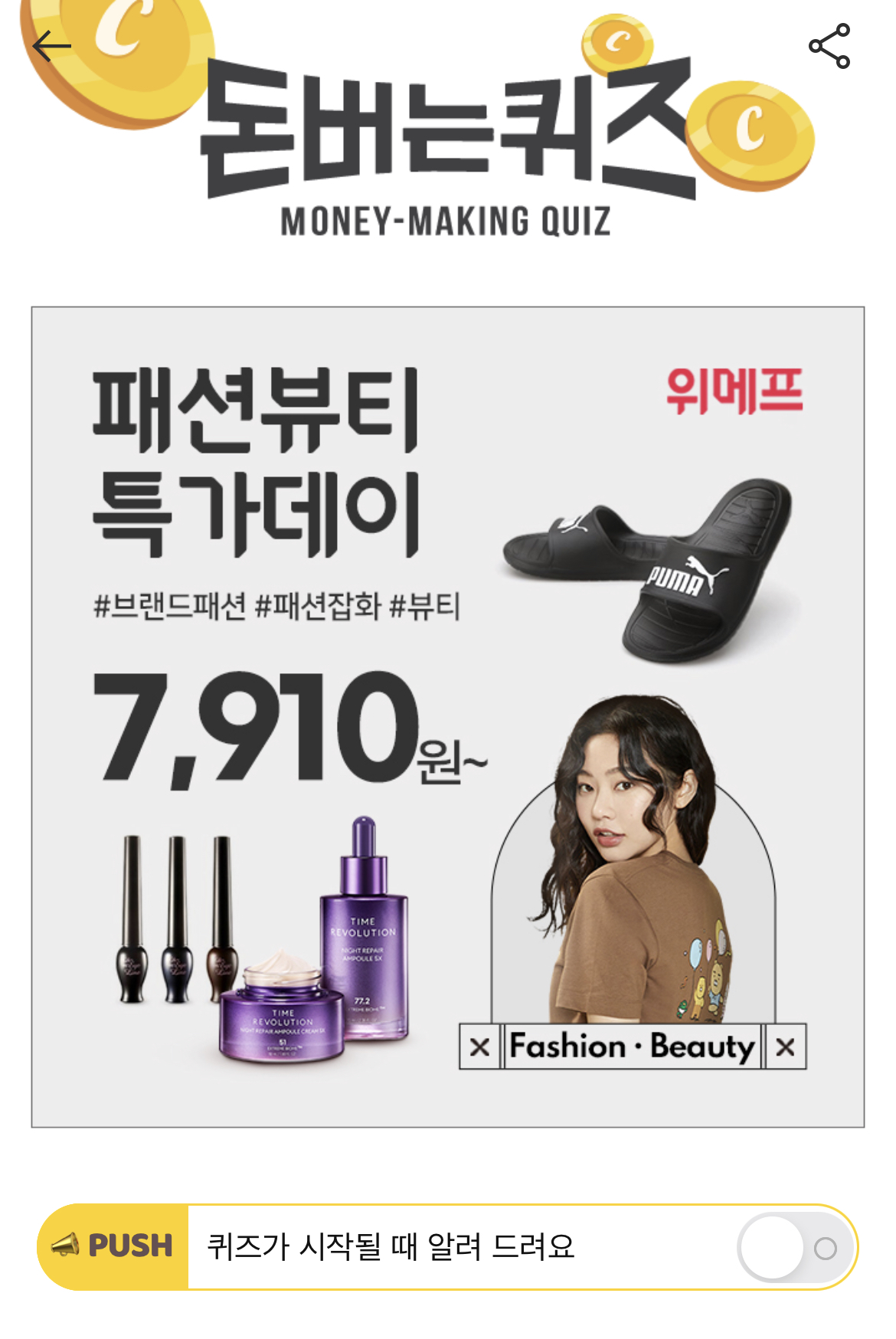 캐시워크 돈버는 퀴즈 정답 위메프 패션뷰티특가데이 ㅍㅅㅈㅎ