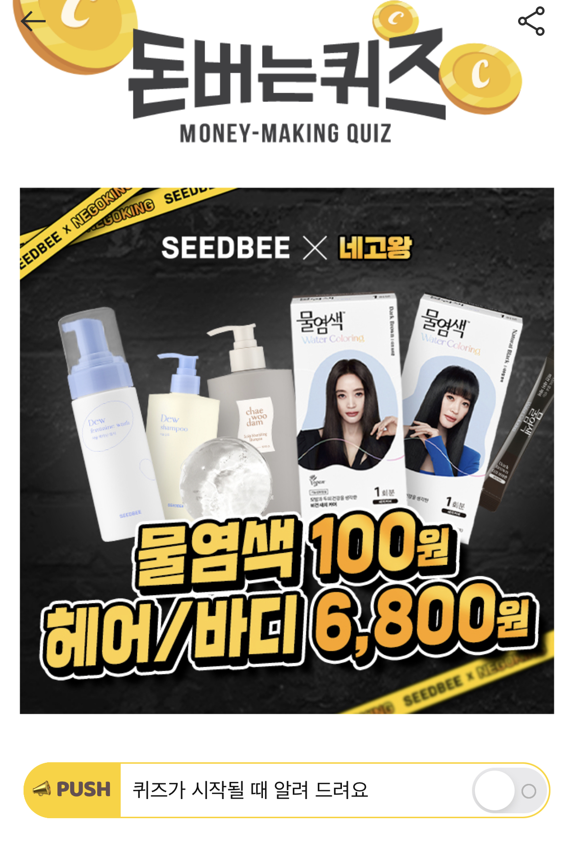 캐시워크 돈버는퀴즈 정답 네고왕 씨드비 물염색 ㅇㅅㅅㅂㅎㅂㅌ/ㅁㅇㅅ