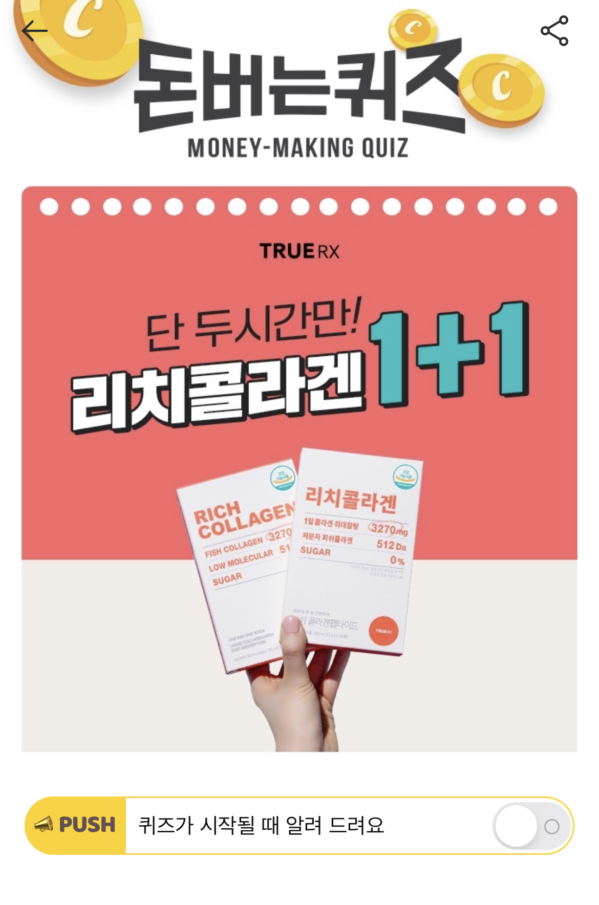 캐시워크 돈버는 퀴즈 정답 트루알엑스 리치콜라겐 ㅎㅅㅎㄹ