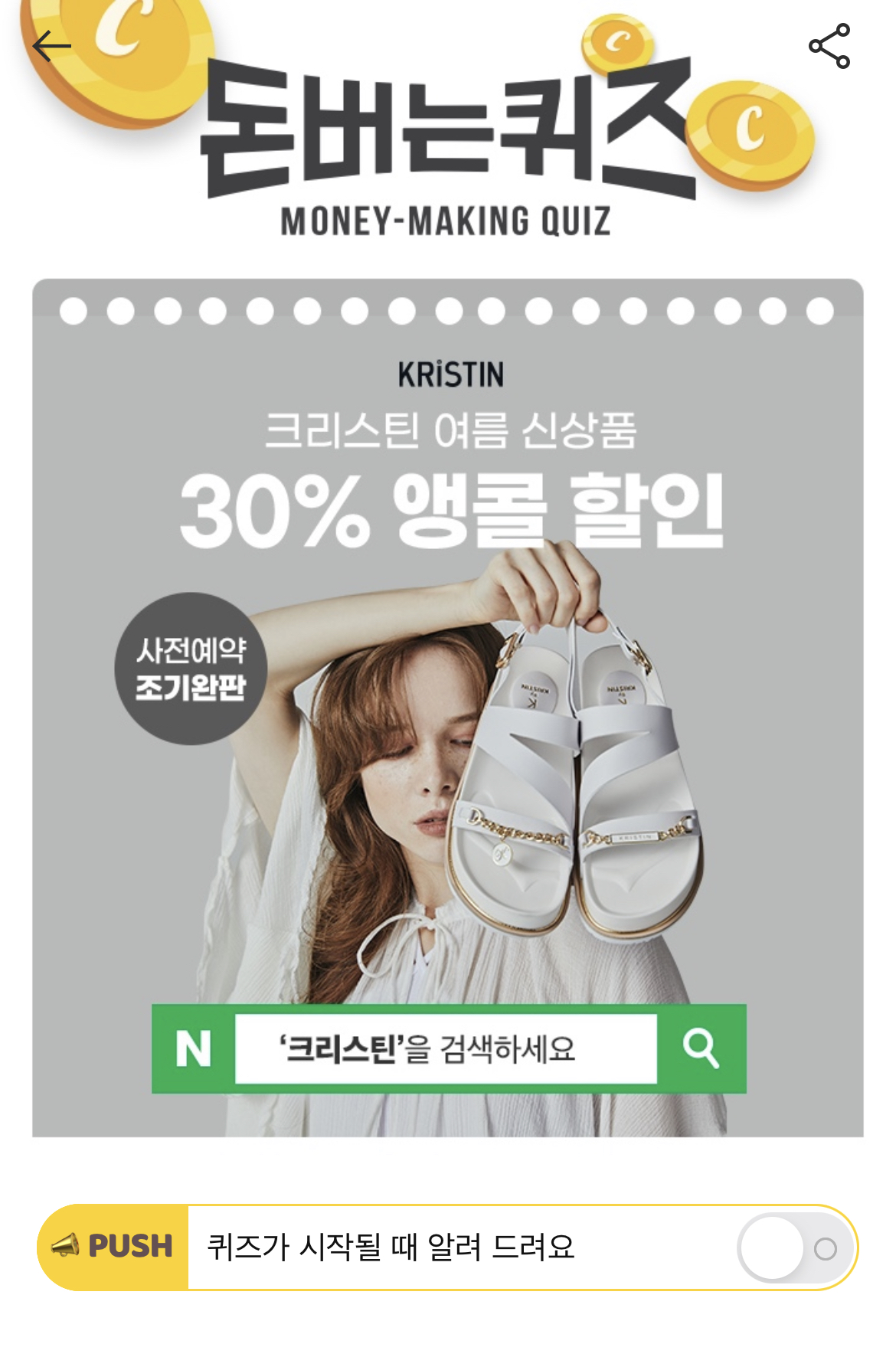 사전예약 조기 완판으로 인하여 아쉽게 1차 기회를 놓친 고객님들께 OO OOO 이벤트를 제공해드립니다! OO OOO에서는 샌들과 슬리퍼 구매 시 30% 할인 혜택을 제공하는데요, 빈칸에 들어갈 단어는 무엇일까요? (힌트 : ㅇㅋㄹㅇㄷ)