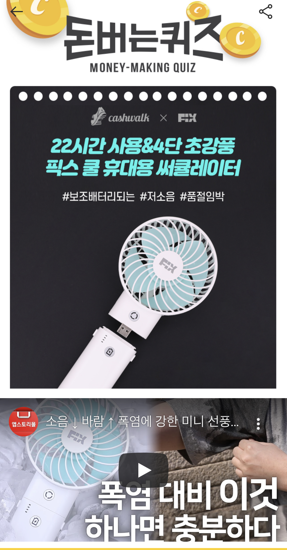 캐시워크 돈버는 퀴즈 정답 픽스 쿨 휴대용 써큘레이터