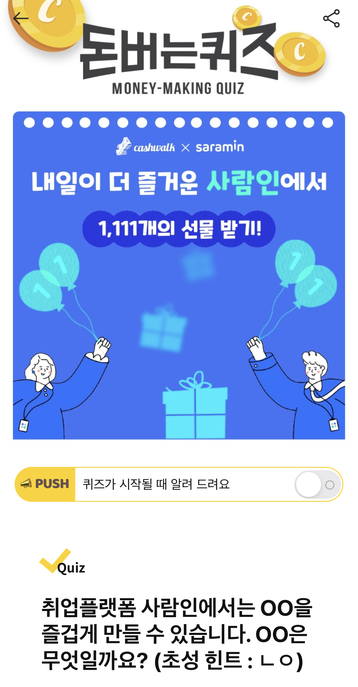 취업플랫폼 사람인에서는 OO을 즐겁게 만들 수 있습니다. OO은 무엇일까요? (초성 힌트 : ㄴㅇ)