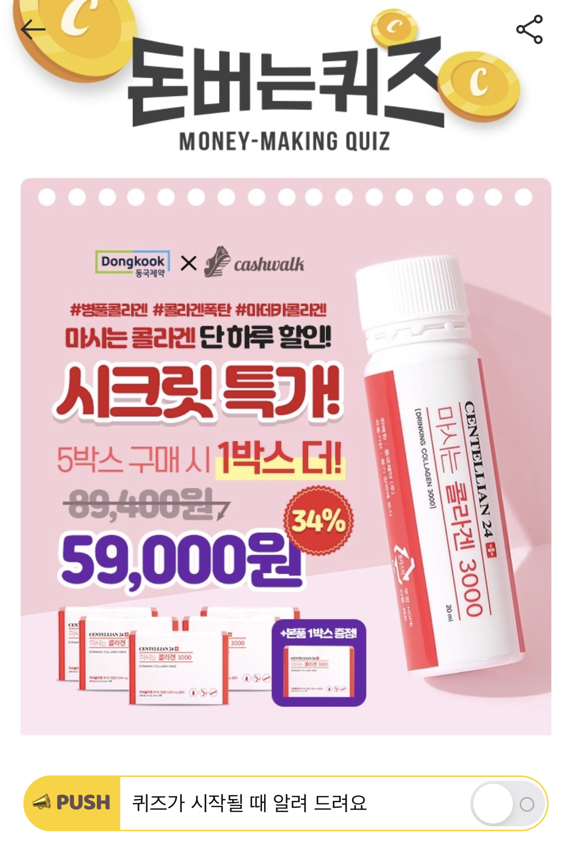 캐시워크 돈버는 퀴즈 정답 동국제약 마시는 콜라겐 맛