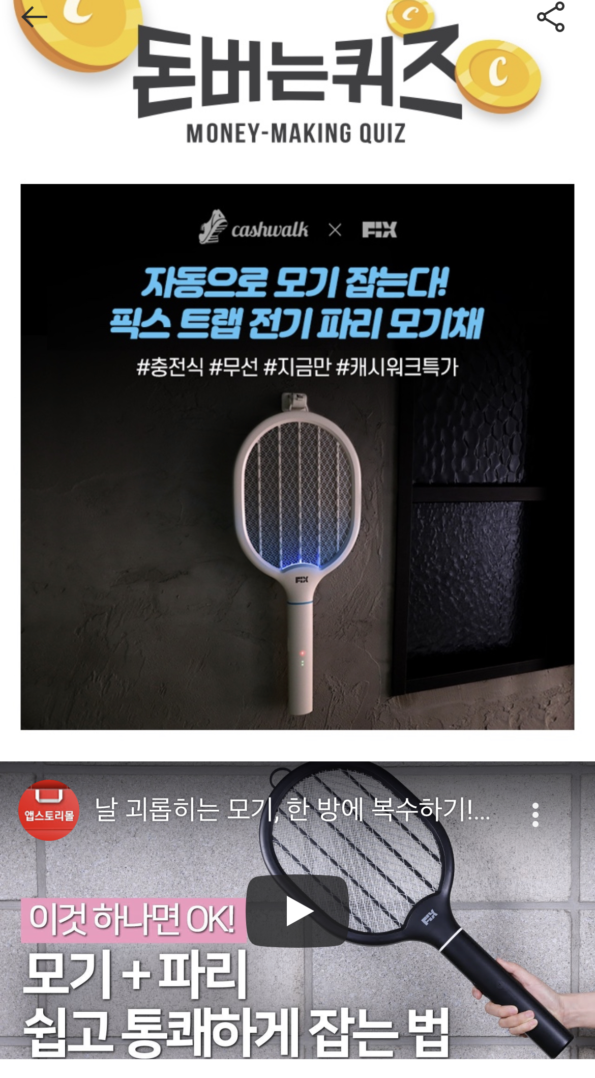 캐시워크 돈버는 퀴즈 정답 픽스 트랩 전기 파리모기채 무선 전기 모기채