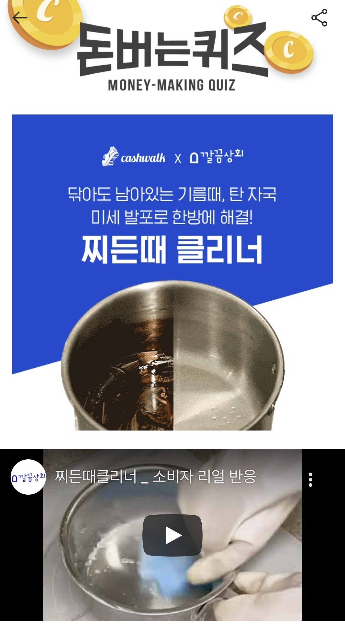 캐시워크 돈버는 퀴즈 정답 깔끔상회 찌든때클리너 ㅂㅇㅅ