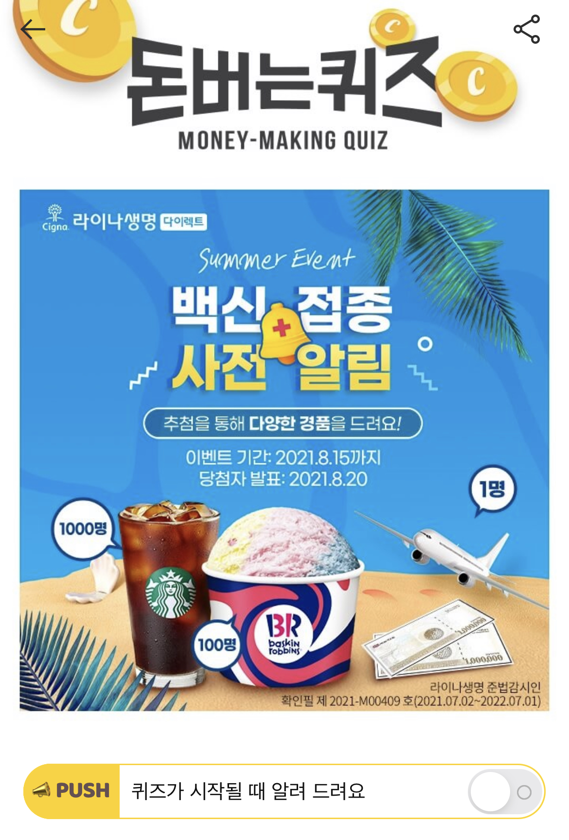 캐시워크 돈버는 퀴즈 정답 라이나생명 백신접종 사전 알림 스타벅스 커피
