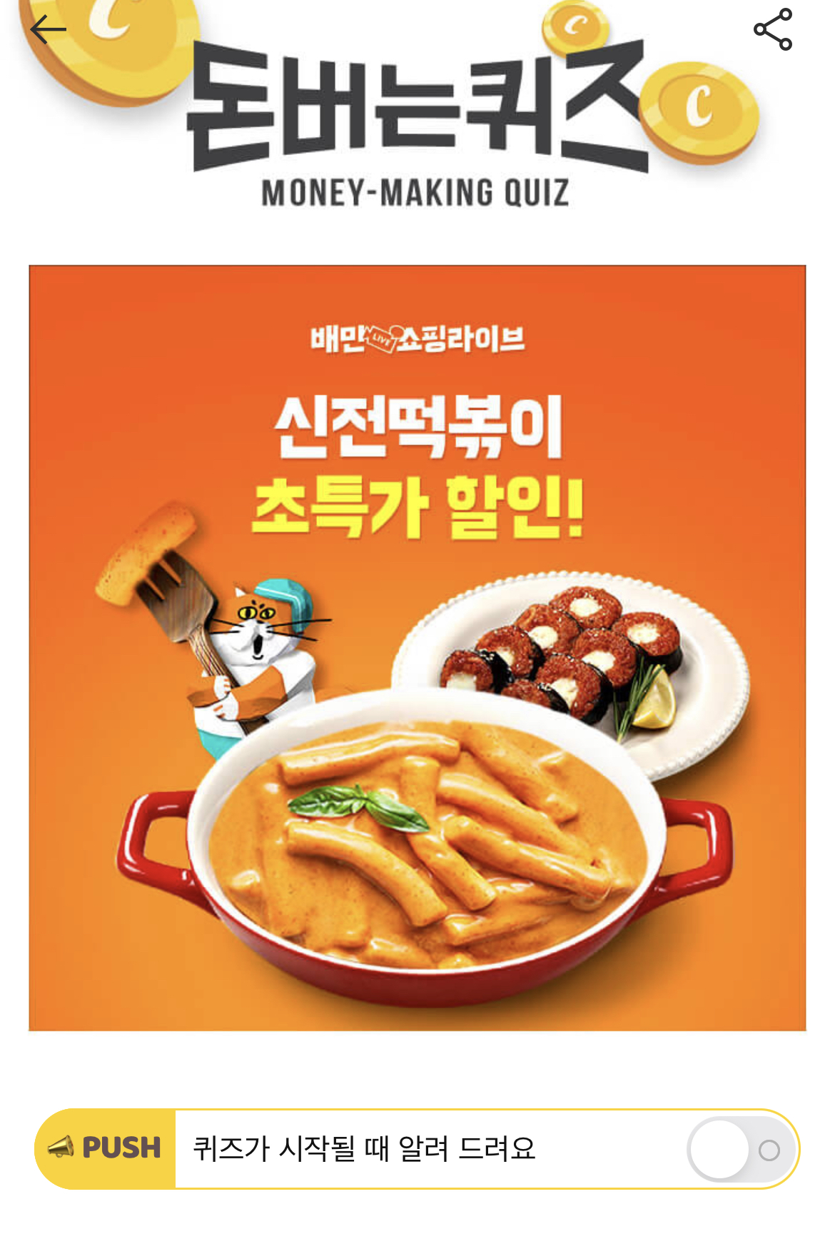 캐시워크 돈버는 퀴즈 정답 배민쇼핑라이브 신전떡볶이 혜택