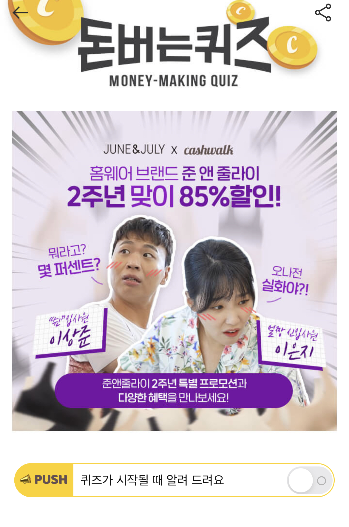 캐시워크 돈버는 퀴즈 정답 홈웨어 브랜드 준앤줄라이