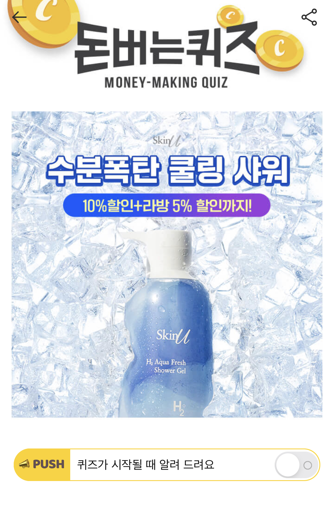 캐시워크 돈버는 퀴즈 정답 스킨유 H2 아쿠아 프레시 샤워젤