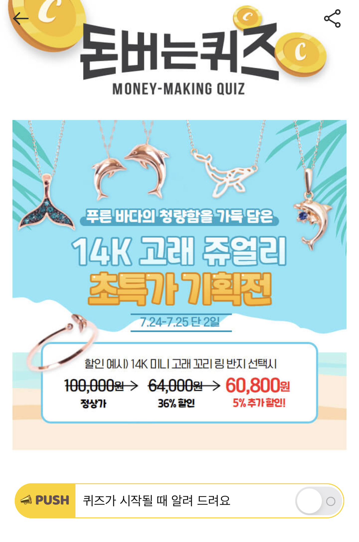 온라인최저가 쥬얼리쇼핑몰 엘렌쥬얼리는 7월 푸른바다의 청량함을 가득담은 14K 미니 OOOO OO O OO를 휴가철을 맞아 반값 이벤트를 진행하고 있는데요~ 행운을 가져다 주는 이 제품은 무엇일까요? 빈칸에 들어갈 단어를 기업해주세요! (힌트 : ㄱㄹㄲㄹㅁㅅㄹㅂㅈ)