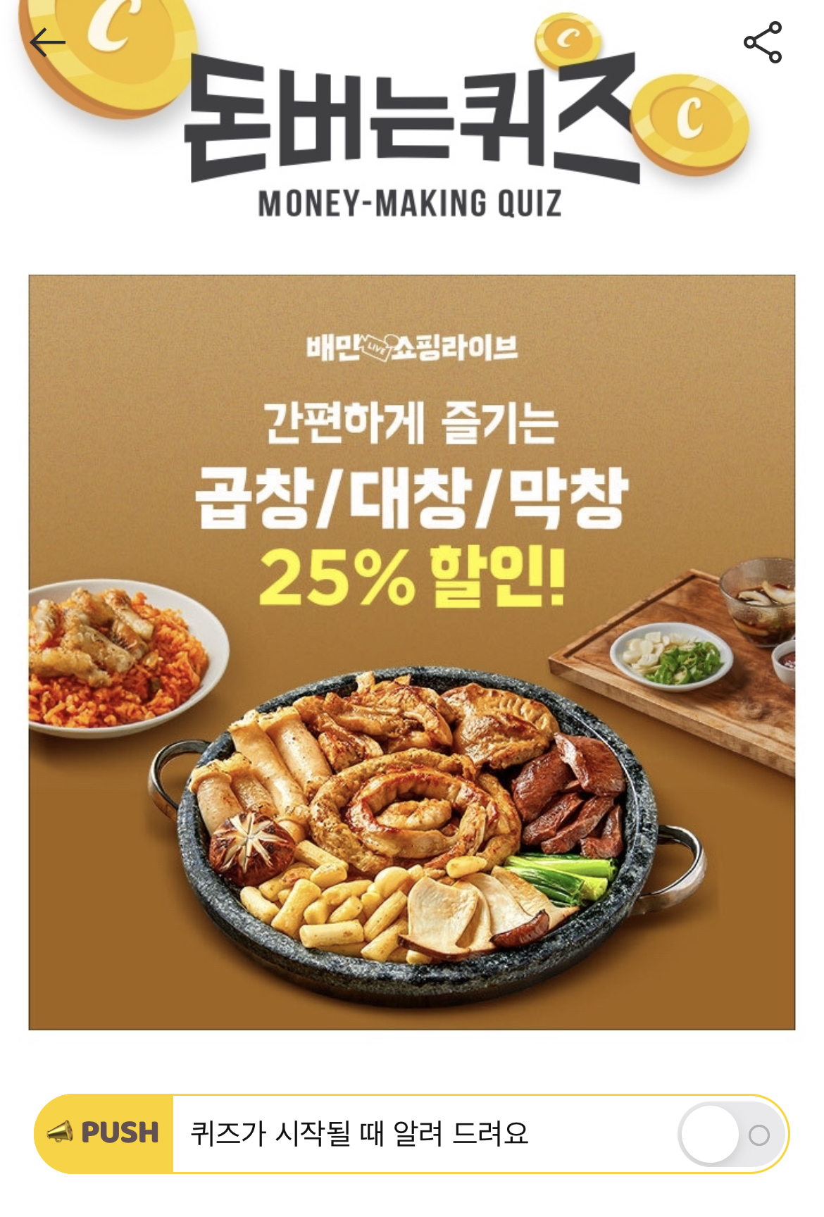 캐시워크 돈버는 퀴즈 정답 배민쇼핑라이브 한우 소곱창/대창/막창