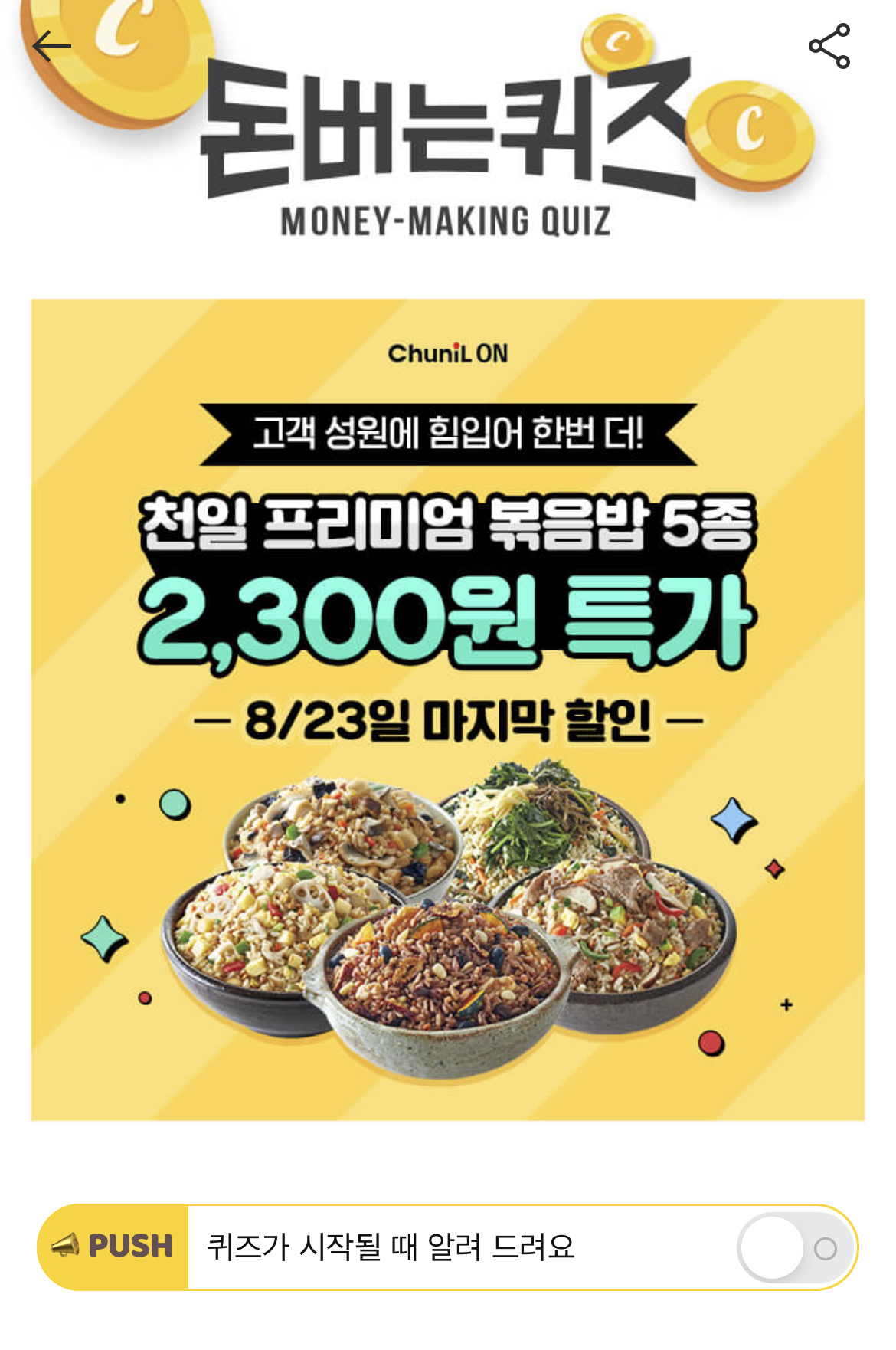 캐시워크 돈버는 퀴즈 정답 천일 프리미엄 볶음밥 ㄴㅌㄹ
