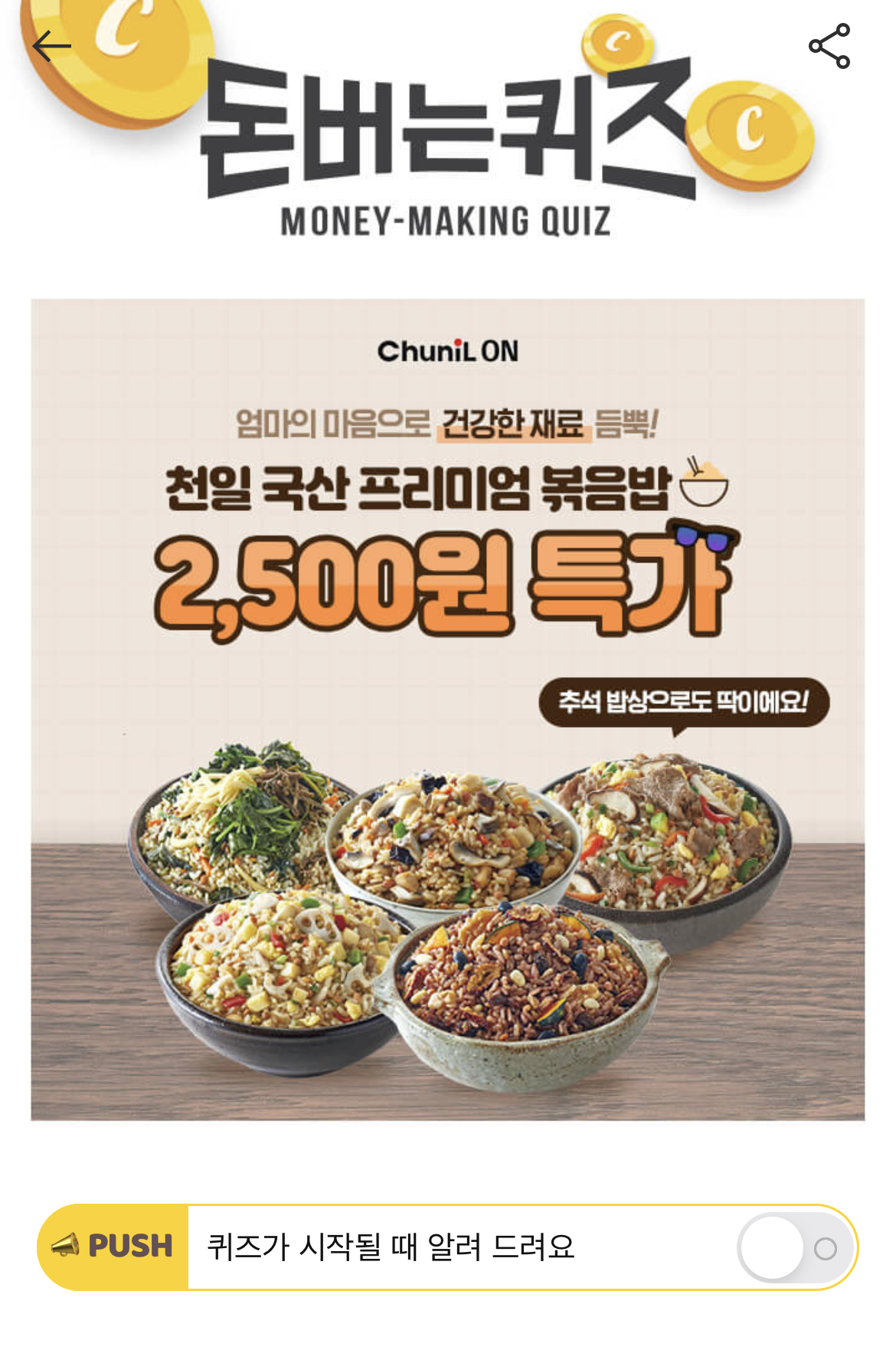 캐시워크 돈버는 퀴즈 정답 천일 프리미엄 볶음밥 ㄷㅎㅂ
